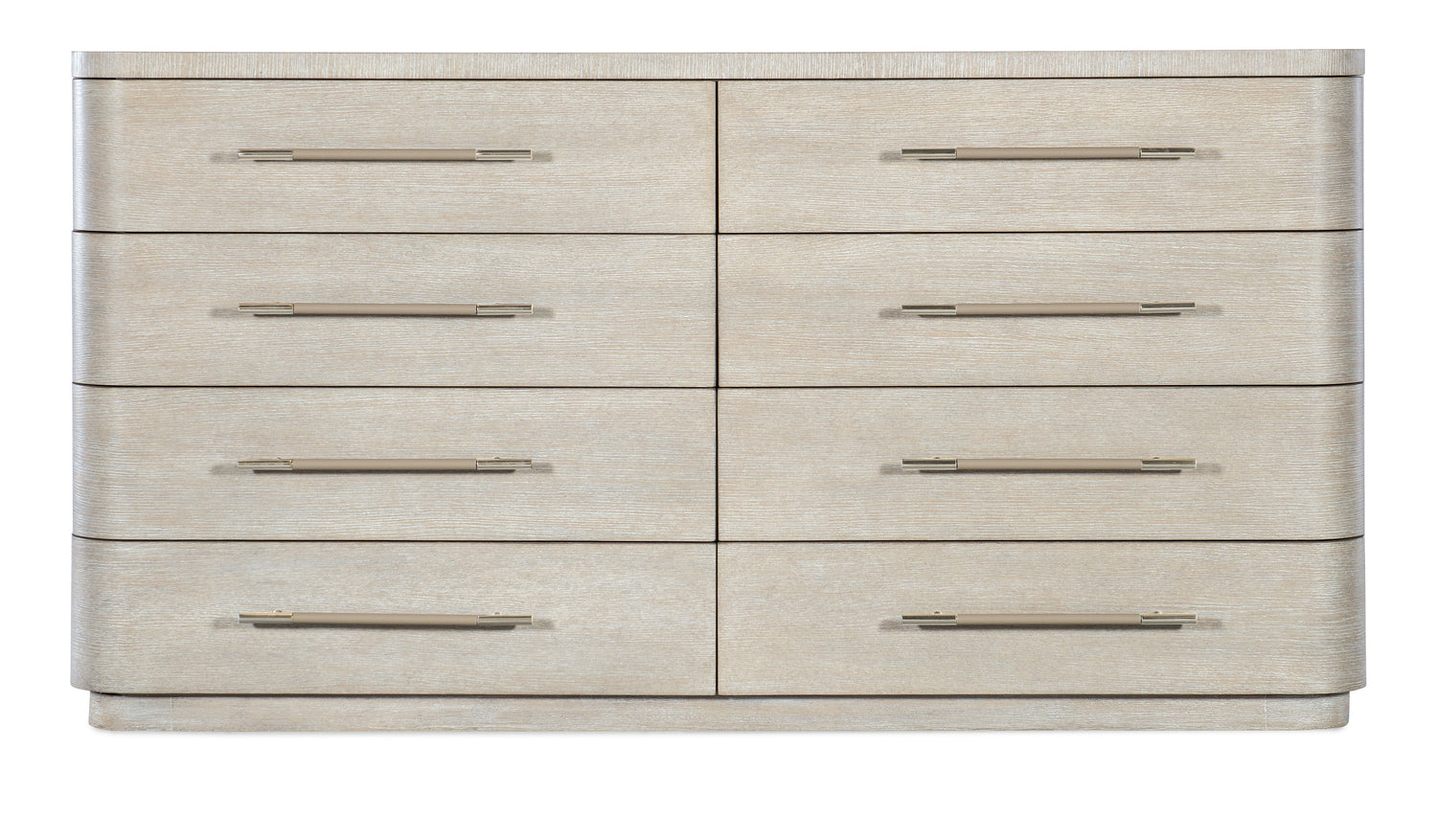 Softly sophisticated with a clean modern profile and luxe mixture of materials, the Modern Mood Dresser is a stunning statement piece. The case has rounded corners and a plinth base and offers 8 self-closing drawers. The top two drawers have drop-in felt liners, there’s a removable jewelry tray in the top right drawer and the bottom two drawers are cedar-lined. Crafted of Oak Veneers, the dresser is finished in the serene Diamond color and accented by metal pulls wrapped in leather.