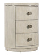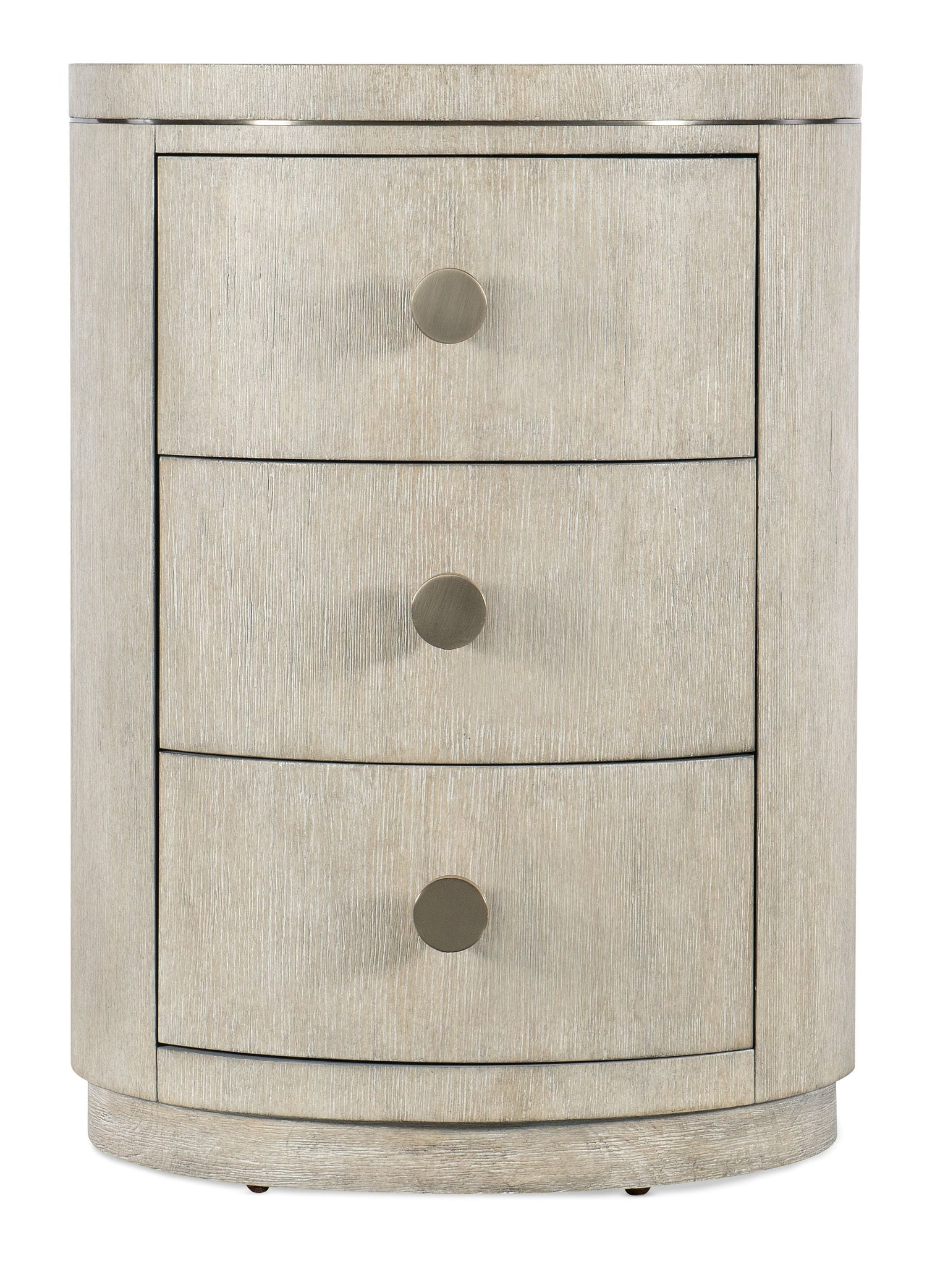 Serene, symmetrical and softly-sophisticated, the Modern Mood Round Nightstand has a clean modern profile and luxe mixture of materials. Offering three self-closing drawers, the nightstand is crafted of Oak Veneers in a crystal-like Diamond finish and has a striking matched veneer top. With metal trim, the knobs are accented by leather.