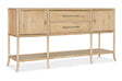 With a laid-back island vibe and mix of organic materials, the Retreat Pole Rattan Sideboard is crafted of Oak and Maple Veneers with rope accents at the joints. The light sand-colored finish is transparent by design to reveal the unique grain patterns of the wood veneer. Featuring ample storage, the sideboard has two doors with magnetic door catches with one adjustable shelf behind each door. There are two self-closing drawers, and the top drawer has a removable felt liner and removable silverware tray. The lower fixed shelf is ideal for display or storage. Soft pewter bar pull and “T” pulls on the doors add a distinct accent.