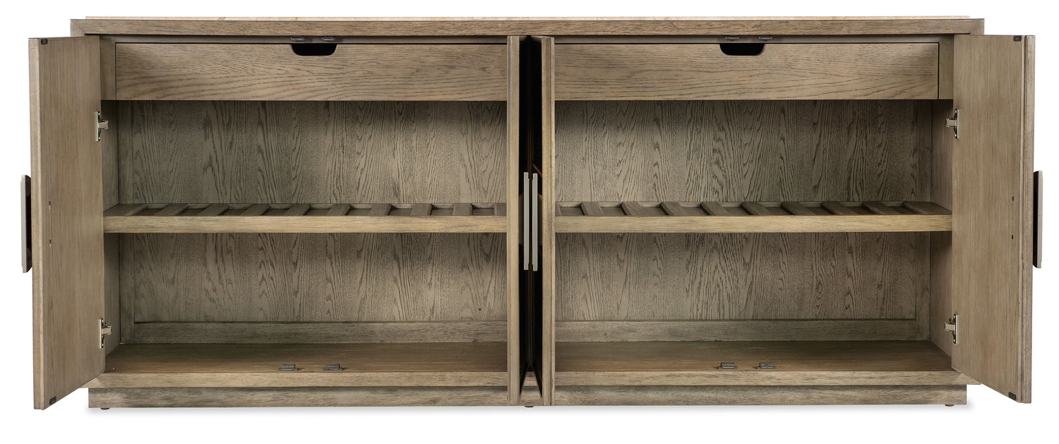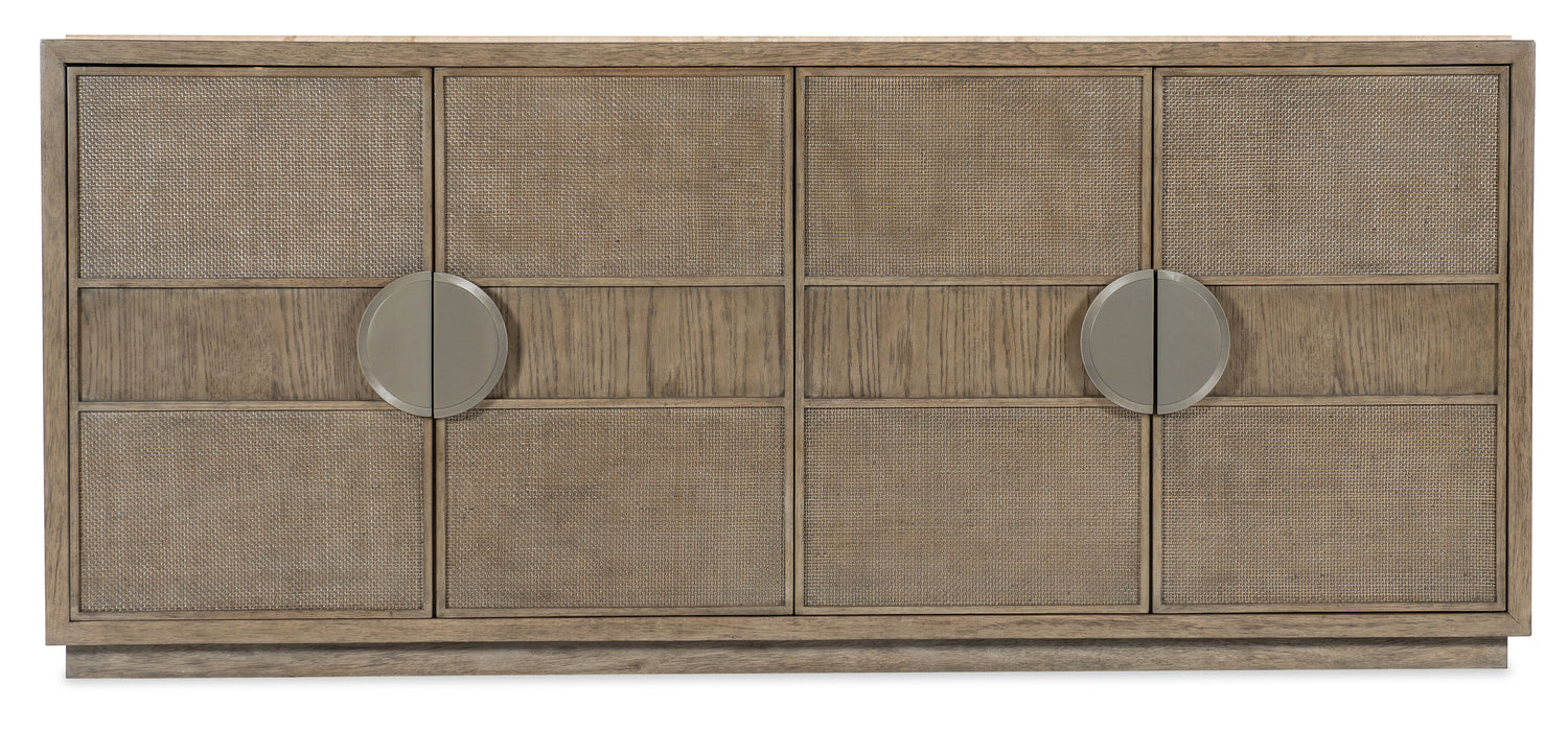Blending organic textures and neutral tones with a refined minimalist silhouette, the stylistically versatile Sonnet Dining Credenza exudes a natural luxury. The four cane-front doors are soft close with magnetic catches, and the left pair of doors has one drawer with a removable cream-colored felt silverware tray. The right pair of doors has one drawer with a drop-in felt liner. There’s one adjustable/reversible wood shelf with wine storage option that holds up to 9 bottles in each pair of doors. The marble inset top combines cream, beige and brown colorations. The frame is crafted of Quartered and Cathedral-Cut White Oak Veneers in a light earthen-toned finish. Satin-finished large semi-circle pulls add a swanky accent.