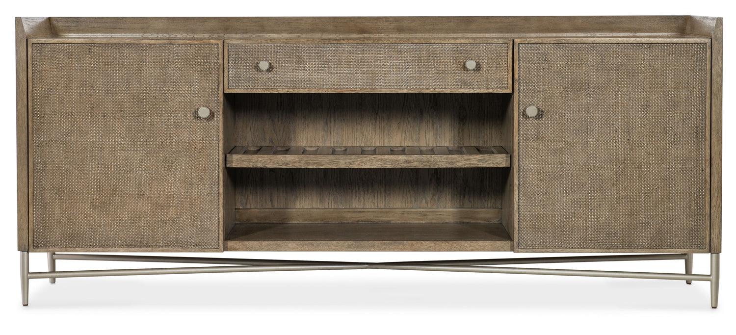 - Center section contains one drawer and one adjustable/reversible wood shelf with wine option that holds up to 9 bottles