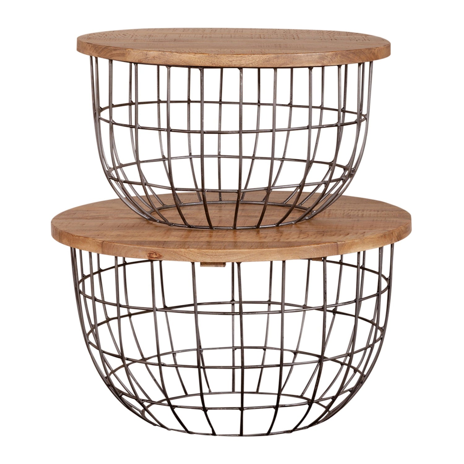 Enhance your space with the Akins nesting caged accent tables. Crafted of mango wood with a weathered honey finish and a pewter base, these two pieces feature solid mango tops, anchored by a heavy gage wire basket base. These unique accent tables will be the highlight of your urban home.