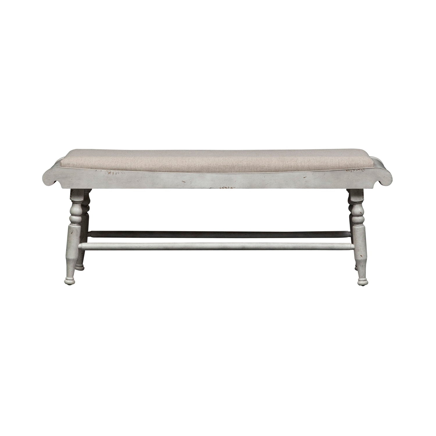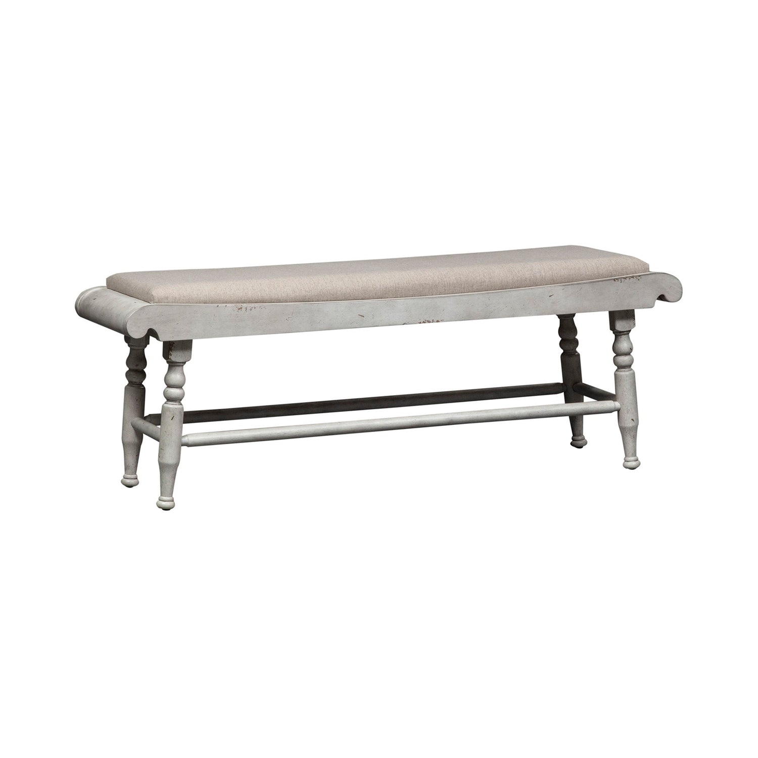 Sit in comfort and style with the Whitney bench. Crafted of rubberwood solids, this piece features an English country charm, linen upholstery, nylon chair glides to protect your flooring, a turned cap rail, and is anchored by turned legs. The antique linen and weathered gray finish gives this group an heirloom appeal.