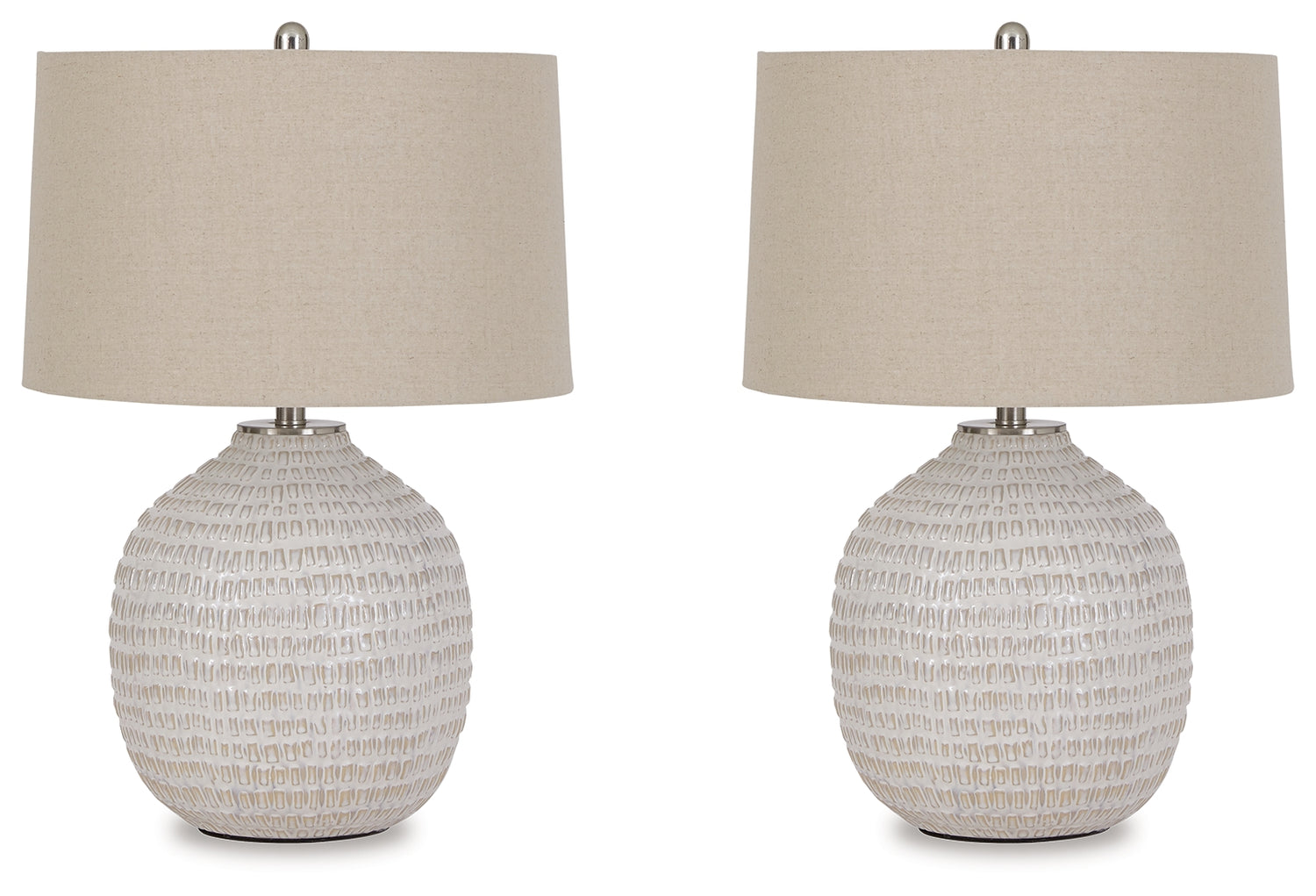 Style and function come together in this textured ceramic lamp set to bring incandescent style to any space in your home. Combining a rounded base, accented with goldtone hardware, this lamp set is capped off with a simple natural lampshade for complete elegance. Pair with a wide variety of furniture styles for a versatile indoor lighting option you'll love.