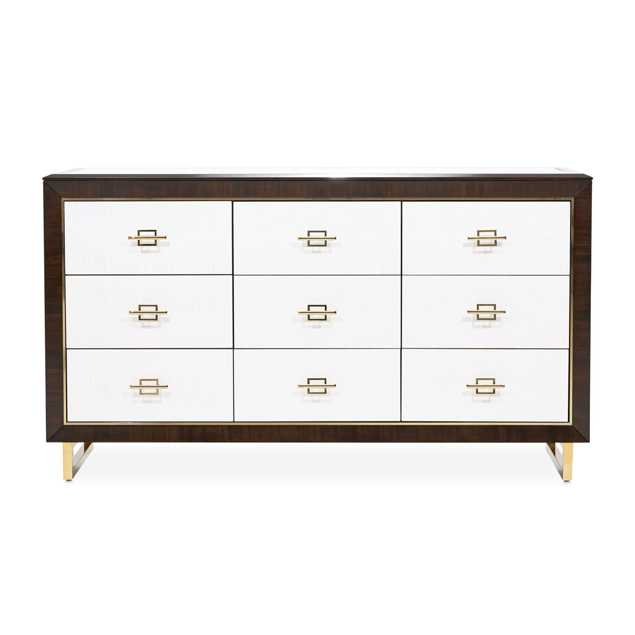 The Belmont Place Dresser is where classic elegance meets contemporary charm. Bask in the allure of the pristine anigre veneer fronts, which are beautifully contrasted against the backdrop of the profound espresso eucalyptus. Each drawer, nestled within a frame accentuated by the glint of Japan plated alloy, promises a world of refined organization. Velvet-lined interiors whisper secrets of luxury, while the dresser’s poised stature, supported by gleaming gold legs, becomes an ode to meticulous artistry.