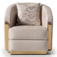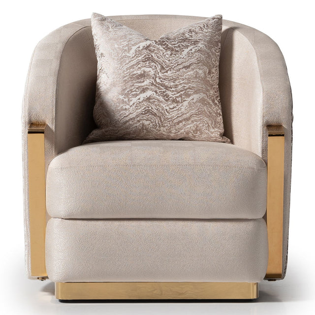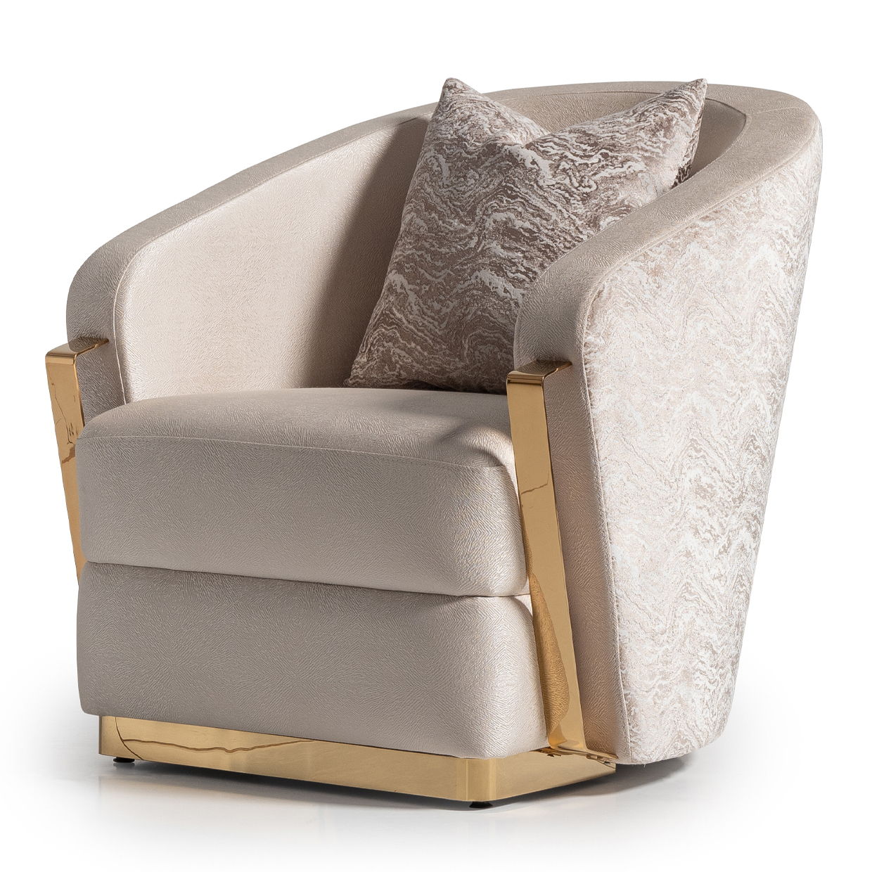 A resplendent creation that exudes refinement and indulgence, sure to be a striking centerpiece in any abode. Wrapped in an understated jacquard fabric, this exquisite piece is elevated by titanium gold metal band arms, adding an extra layer of opulence to its already stunning design. But the true hallmark of this chair is the breathtaking marble-look velvet on the back, evoking a sense of timeless grandeur and luxury. The matching marble pattern accent pillow is the perfect accompaniment, perfectly complementing the chair's artistry.