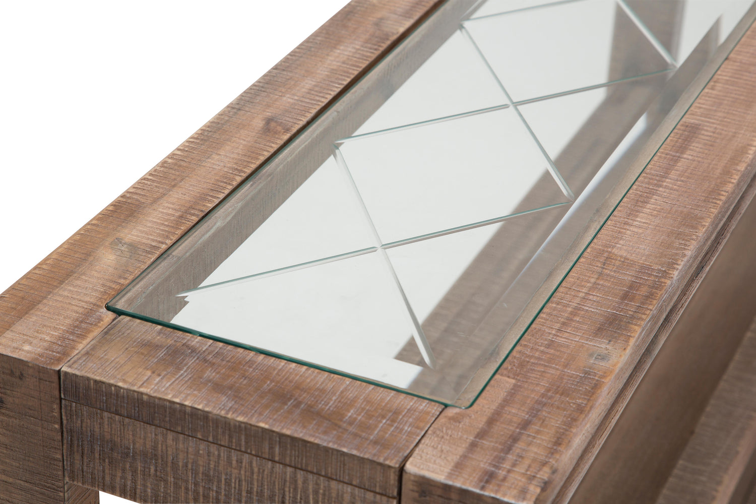 - Legs, tiers, and table frame are constructed using Acacia wood solids and Acacia Veneer in a Driftwood finish