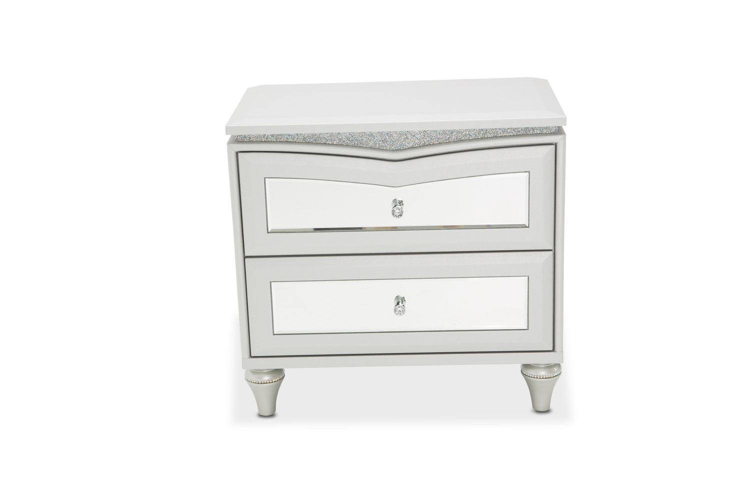 - Drawers feature beveled mirror faces, and crystal inserts within the pulls