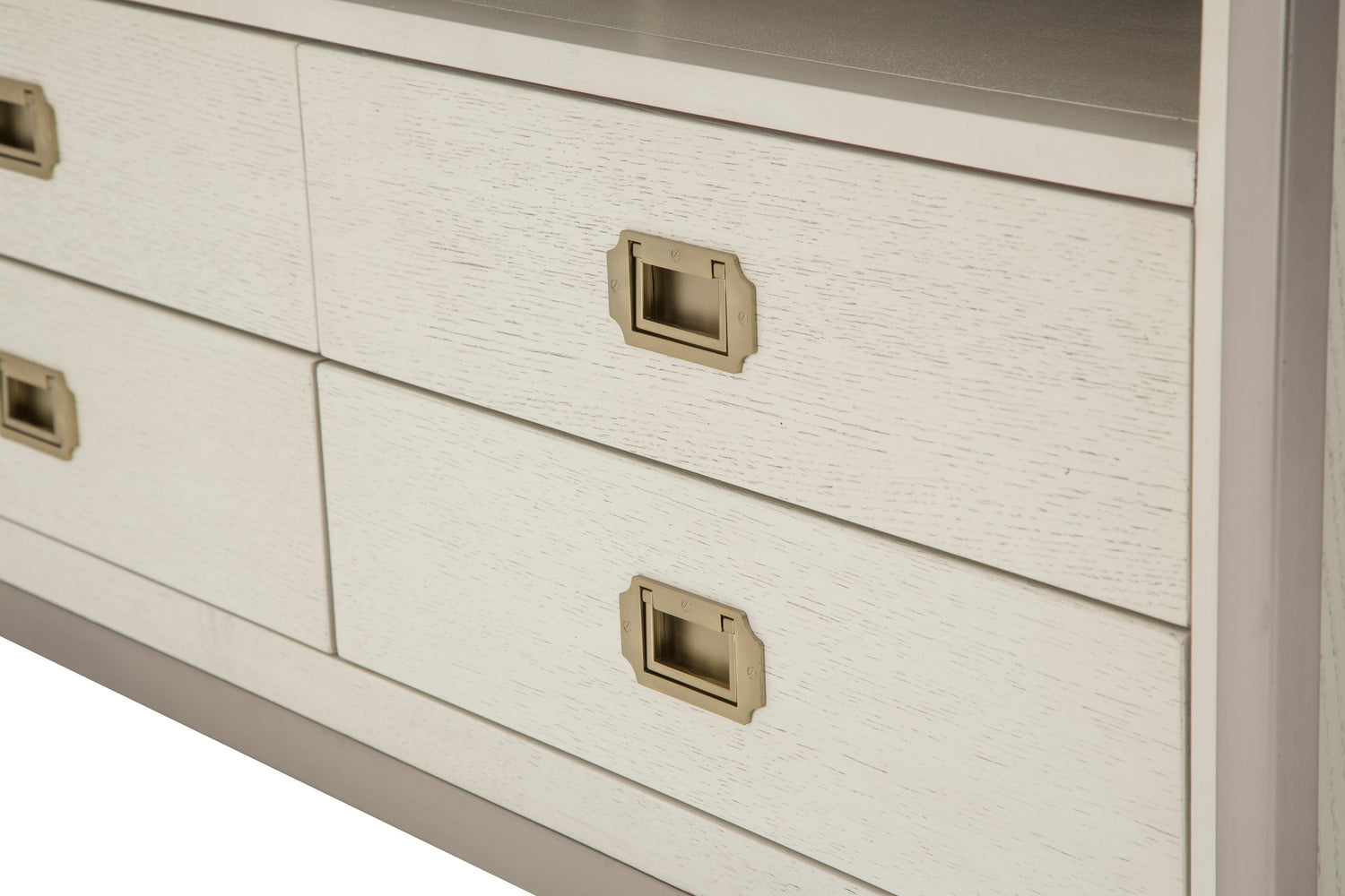 - Features metal campaign hardware and decorative nailheads in a bronze finish