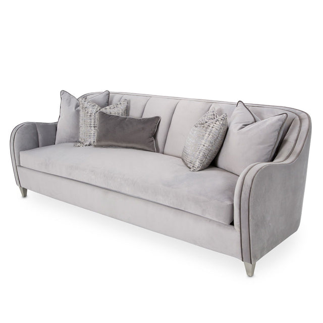 • Sofa is upholstered in a pale gray velvet