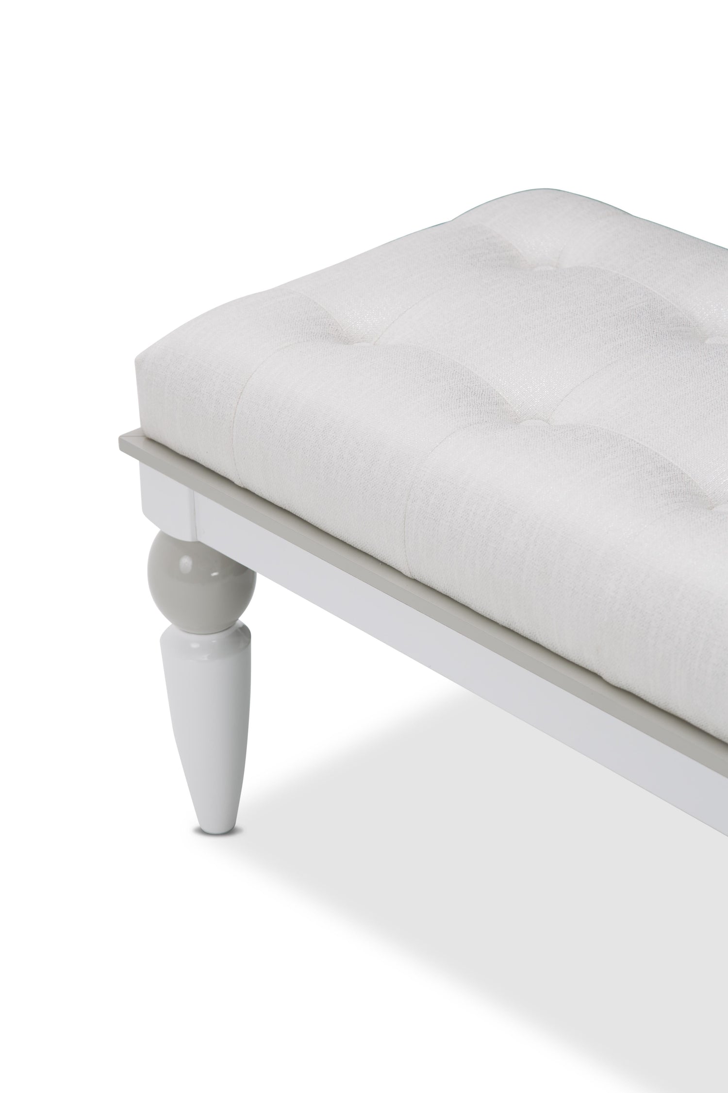 - Bench is upholstered in a woven fabric with silver metallic print and button tufts