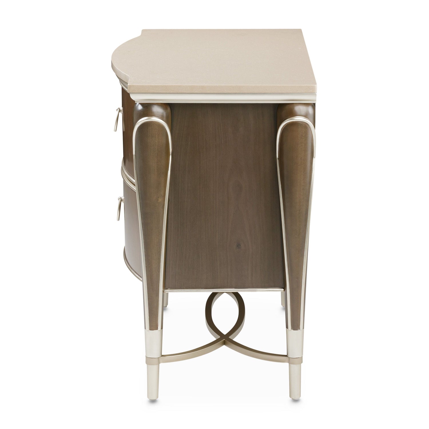 - Hoop drawer pulls, and feet, and stretcher are finished in Chardonnay