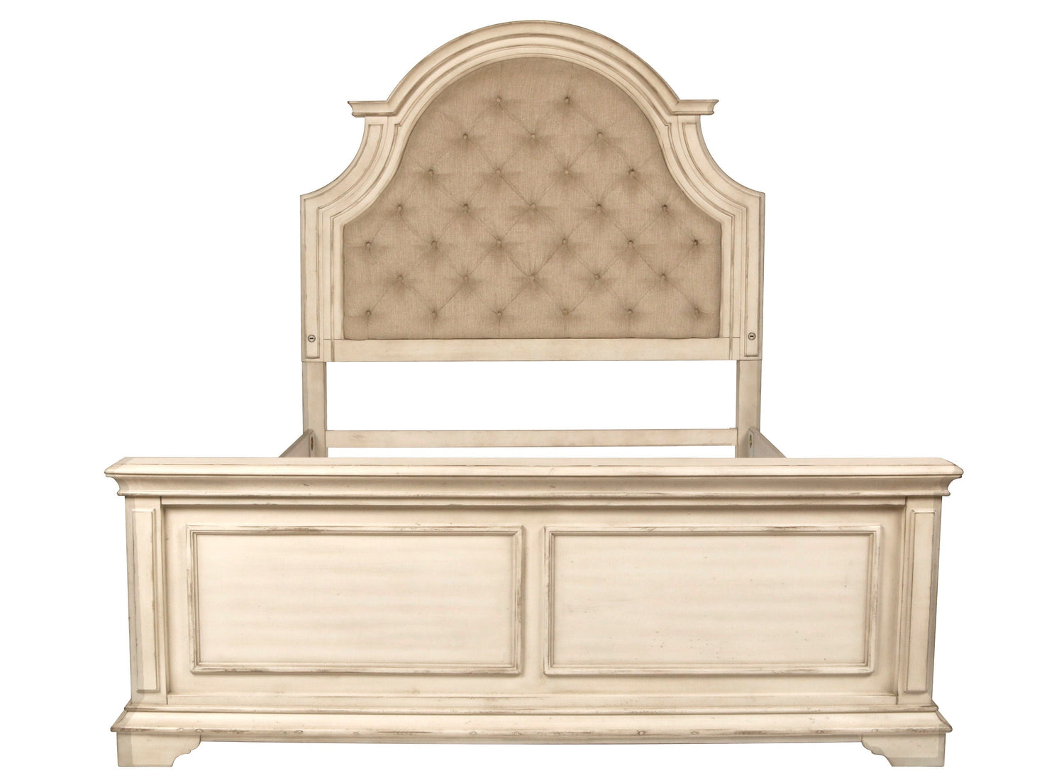 Romance your bedroom with the New Classic Furniture Anastasia Bed, a marvel of real wood construction crafted from solid poplar and oak veneer for unparalleled durability. The heirloom finish, achieved through a meticulous multi-step process involving wire brushing, clefts, rasping, threading, and rub throughs, creates an upscale, vintage look with each piece being one-of-a-kind. The creamy off-white stain, enhanced with burnishing, exudes vintage French country cottage charm. Softly arched molding frames the easy-care 100% polyester button-tufted upholstered headboard, creating a welcoming ambiance. This bed goes beyond aesthetics with functional USB charging ports on either side of the headboard, providing a convenient place to charge devices. All furniture complies with safety standards, ensuring your comfort and peace of mind. With a 1-year limited warranty, the Anastasia Bed seamlessly combines timeless design with modern functionality for a secure and stylish addition to your bedroom.