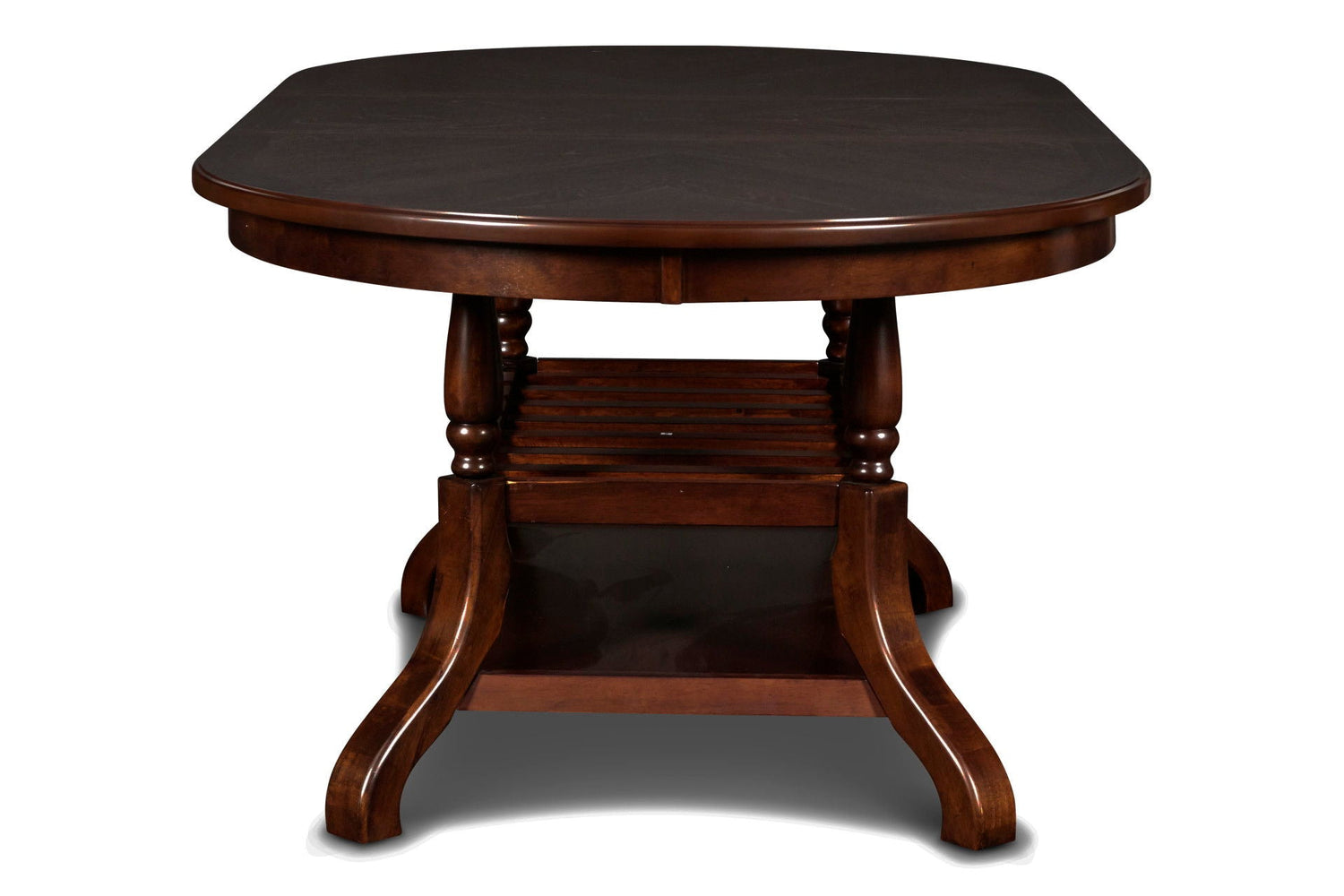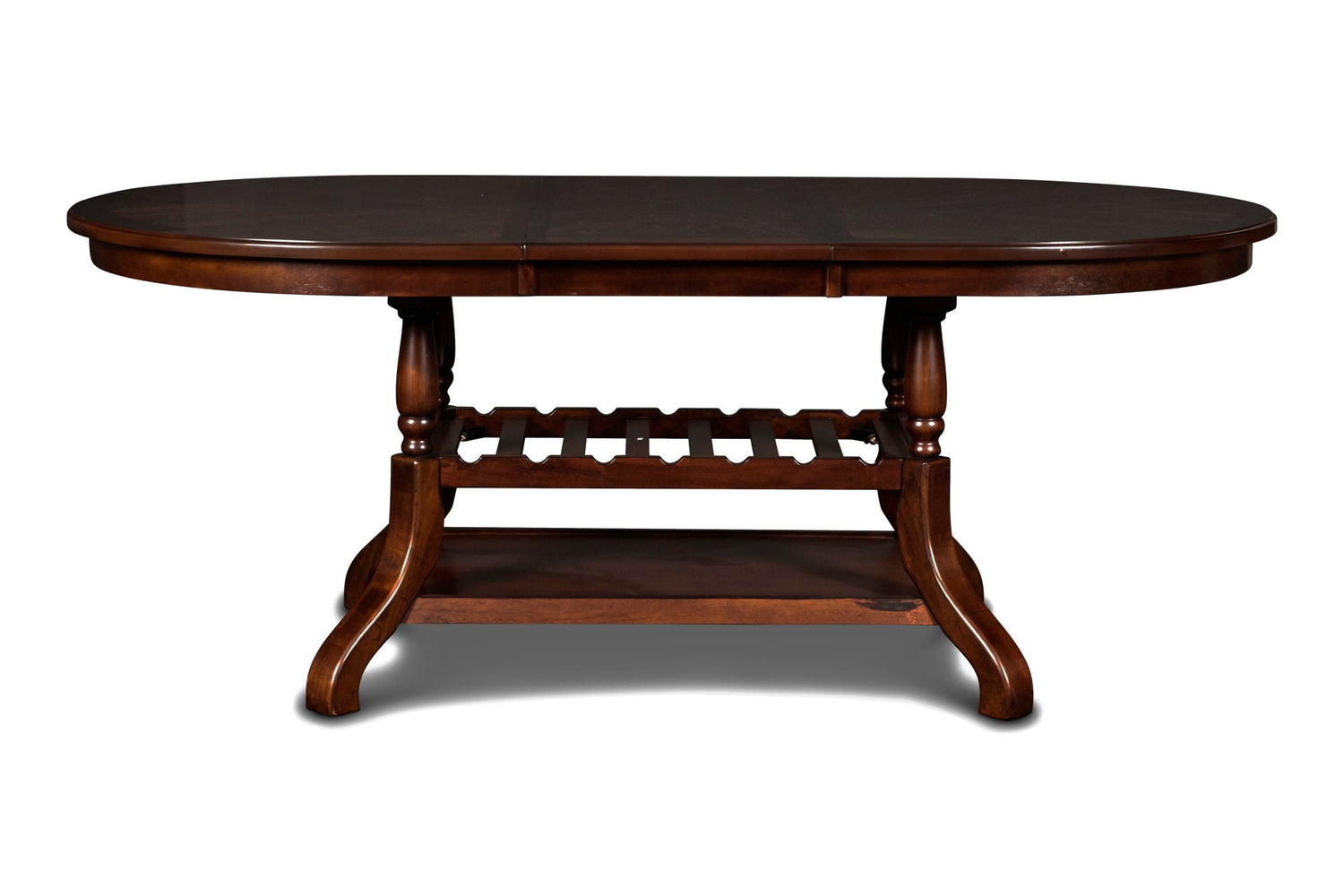 - Sophisticated Design: The table features a classic oval shape complemented by a sturdy turned pedestal base, which exudes traditional charm. The design is enhanced by an integrated lower shelf with wine storage racks, seamlessly combining elegance with practical functionality, making it a perfect centerpiece for both formal dining rooms and cozy kitchen spaces.