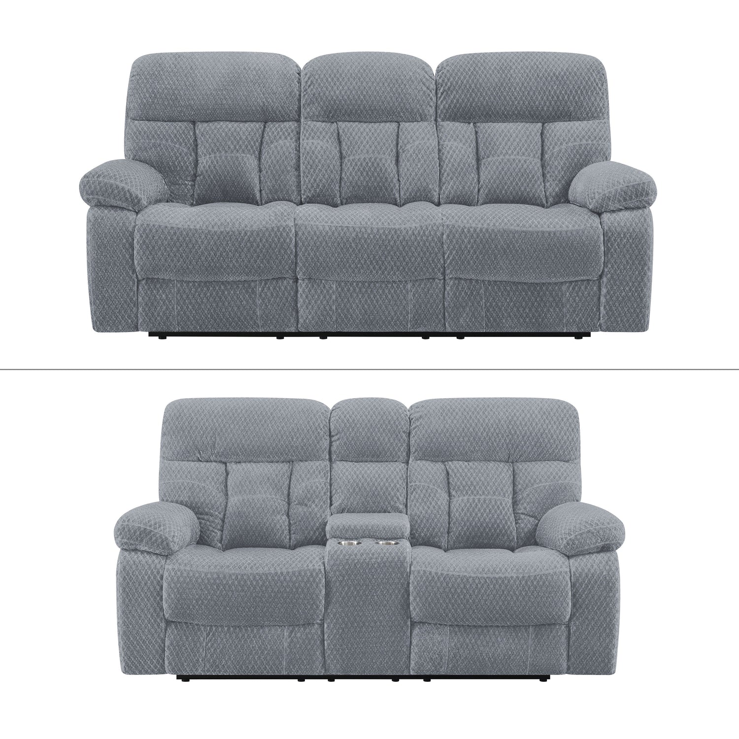 Meet your new favorite spot to unwind – the Bravo Manual Reclining Set. Crafted for both style and comfort, this set includes a reclining sofa and a console loveseat, upholstered in blankety soft, 100% polyester easy-care fabric. Sink into generous pillowed arms and headrests, while the channel back and comfy bucket seats envelop you in relaxation. Fully upholstered chaise recliner footrests elevate your lounging experience to new heights. With hardwood and manufactured wood frames, coil spring cushions, and no-sag seat suspension, this set promises years of quality seating. Enjoy added convenience with the sofa''s drop-down center tray for beverages and snacks, and the loveseat''s center console with built-in cupholders easy access to your favorite drinks and storage cubby for remote control storage. Whether your style leans contemporary or traditional, the versatile Bravo collection seamlessly complements any decor.