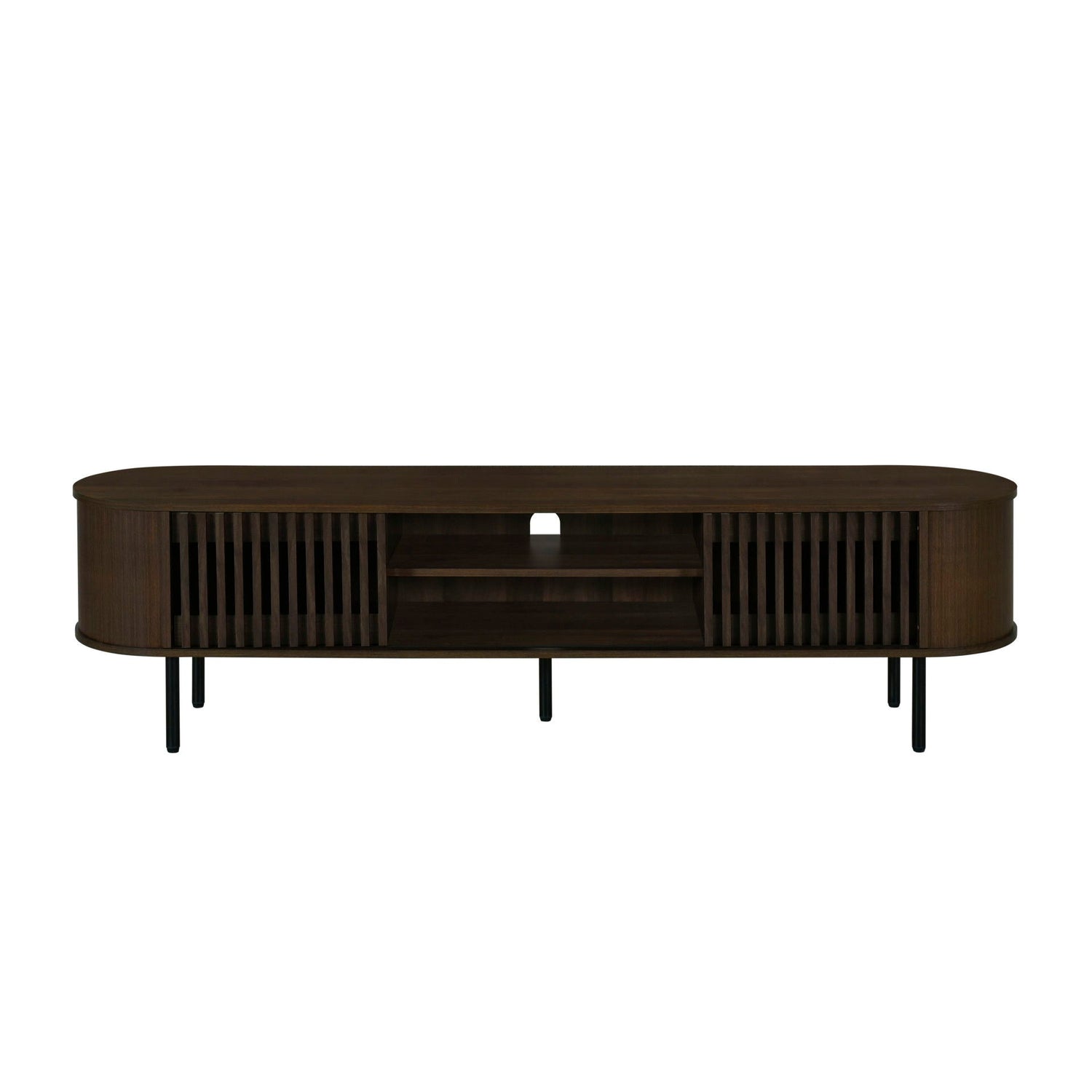 The Brax 70" TV Console with Sliding Doors combines sturdy, eco-friendly construction with ample storage and modern style. Crafted from manufactured wood and covered in durable, environmentally friendly decorative laminate, this console is not only sleek but also sustainable. With its 71" width, it offers plenty of space on top to accommodate large-screen televisions. The sliding tambor doors not only conceal components but also reveal decorative storage space, allowing for both practicality and aesthetics. Its mid-century modern appeal is enhanced by black metal legs and rounded edges, giving it a contemporary touch. The tambor-style doors further add character and distinction to the design. The natural beige finish adds warmth and versatility, complementing a variety of décors. Whether your style is modern, transitional, or eclectic, this console is sure to enhance your living space with its combination of storage and style.