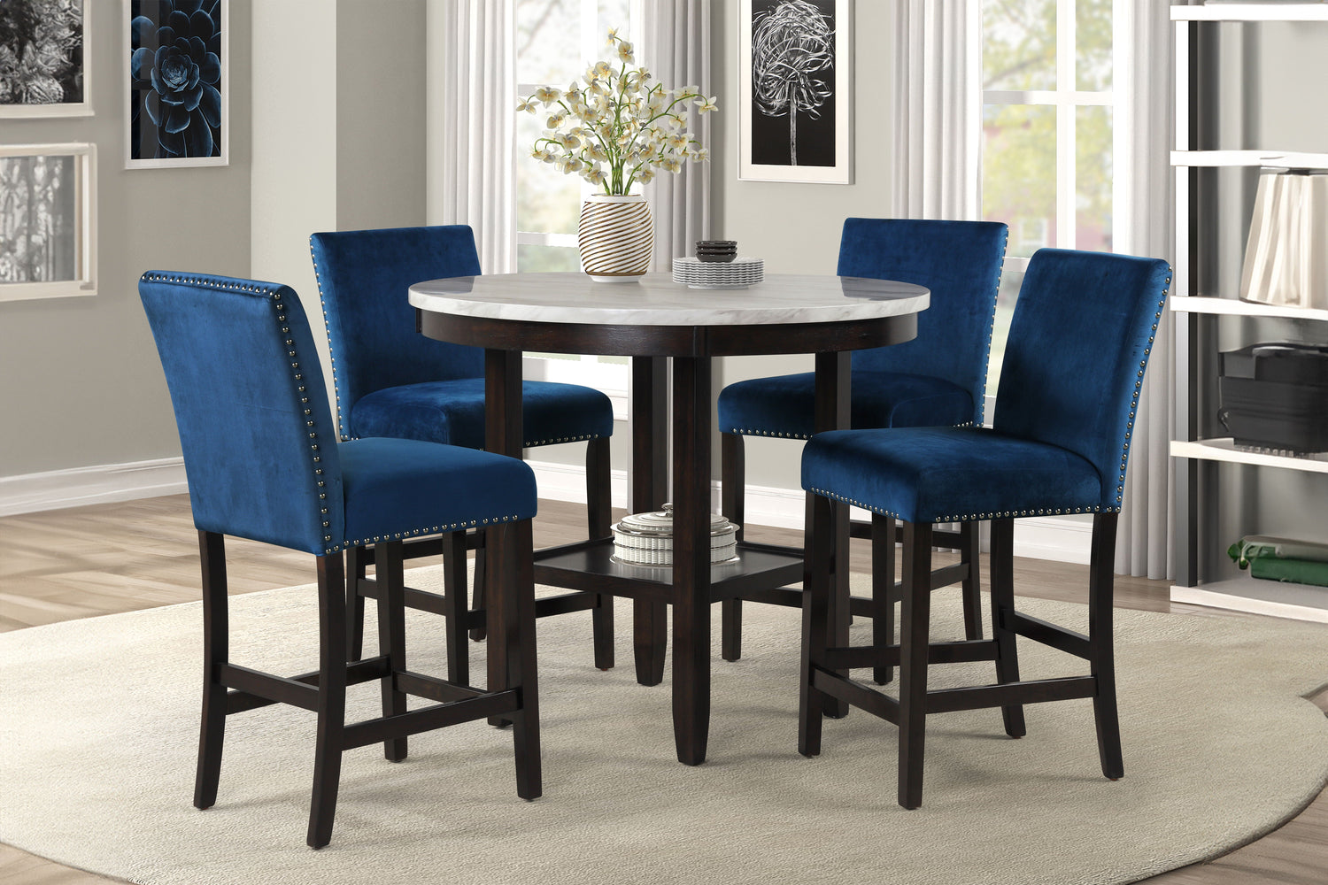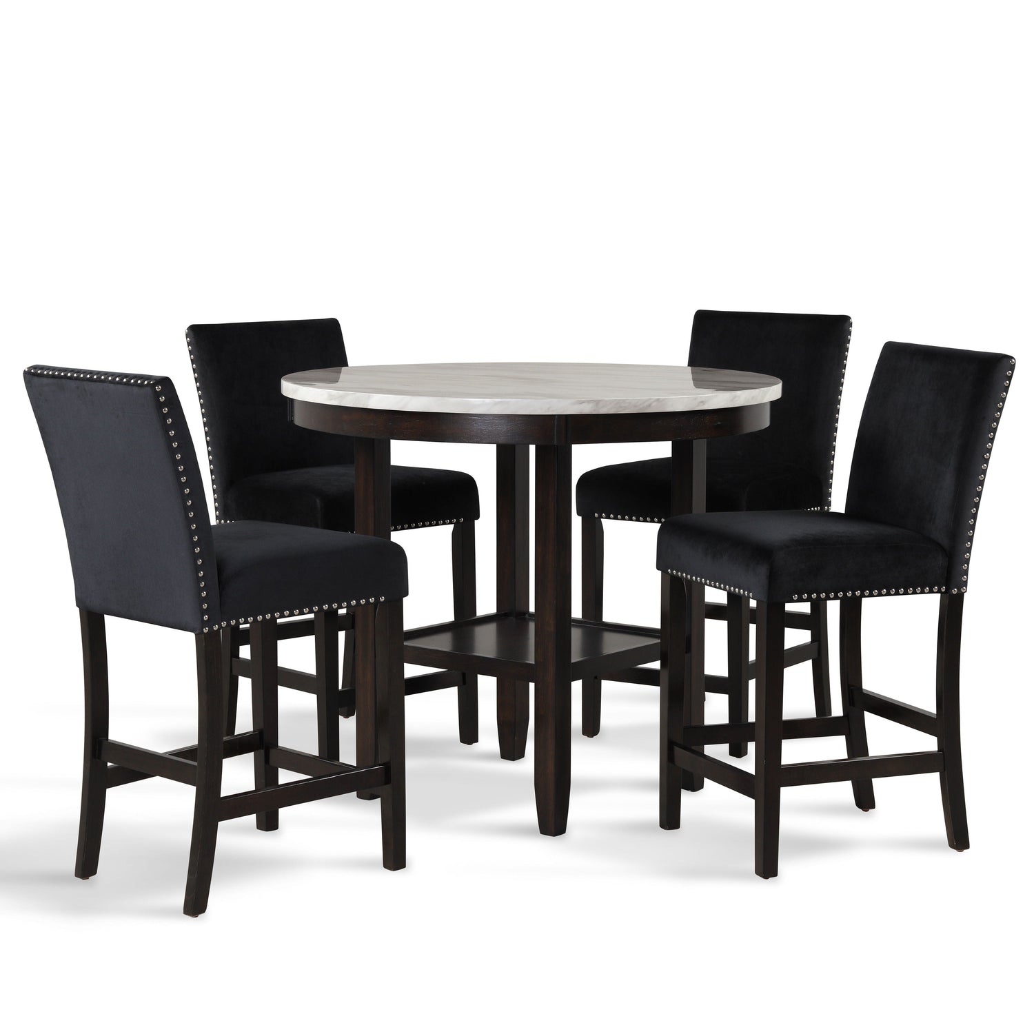 The Celeste Counter Dining Set is an exquisite combination of modern sophistication and enduring craftsmanship. This set includes a chic 42-inch counter table with a base and a faux marble top, accompanied by stunning velvet chairs. Crafted from solid Rubberwood and high-quality manufactured wood components, the dining set is designed for longevity, ensuring a lasting addition to your dining space. The glossy finish on the tabletop provides both heat and water resistance, ensuring easy cleaning and protection from wear. The white and gray veined faux marble top, complemented by deep espresso legs, creates a contemporary and glamorous ambiance. Luxurious seating awaits with the soft and durable 100% polyester velvet fabric covering sumptuous memory foam cushions, offering both comfort and easy maintenance. The stability of the counter chairs is enhanced by four base stretchers, which double as convenient footrests. Tailored for elegance, the rich and luxurious colors of the velvet chairs are enhanced by silver nailhead trim, providing a sparkling final touch to this impeccable dining set. Elevate your dining experience with the Celeste counter dining set—a fusion of contemporary glamour and enduring quality.