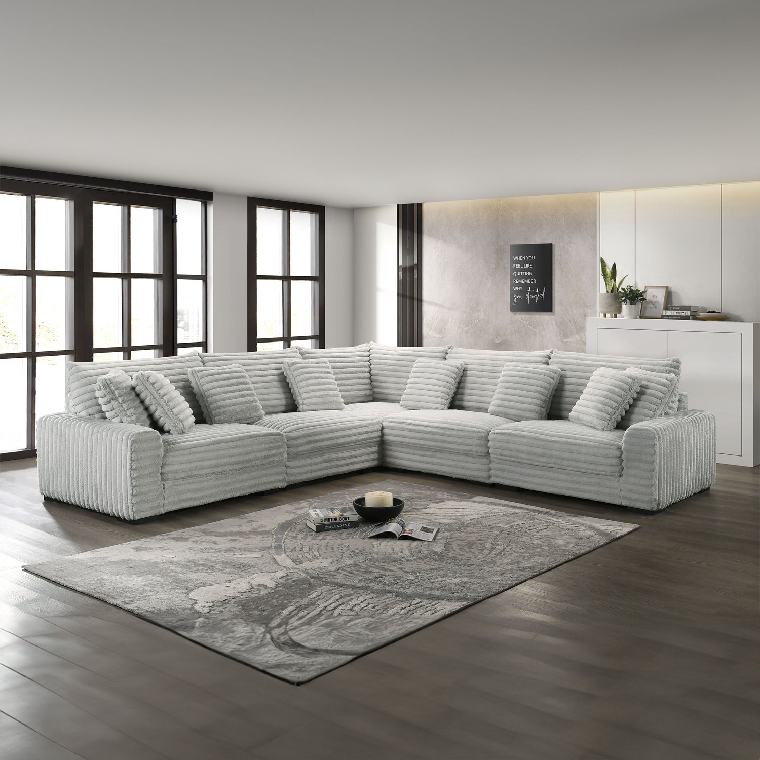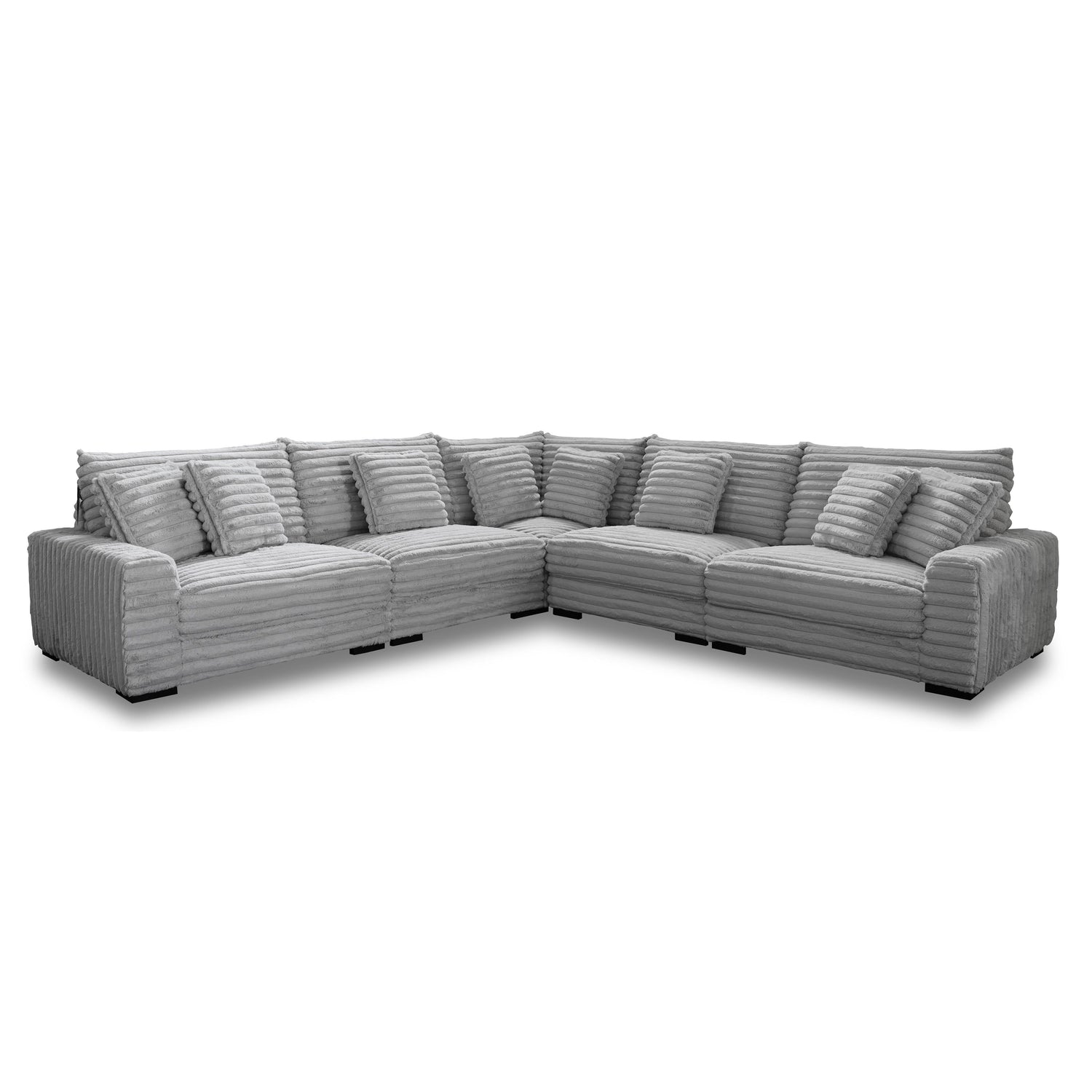 The Embrace Modular Sectional is an epitome of comfort and style, designed to cater to your lounging needs. It includes a right arm facing chair, a left arm facing chair, two armless chairs, a wedge, and eight accent pillows, all crafted from 100% charcoal gray polyester fabric that feels as cozy as a blanket. This sectional offers high-density, resilient foam cushions for relaxing and supportive seating, comfortably accommodating up to eight people. Its frame, constructed from a blend of solid and manufactured woods, ensures durability and long-lasting use. The luxurious ribbed channel fabric adds a touch of elegance, while the abundance of snuggly pillows invites you to lounge and unwind, making the Embrace sectional a versatile addition to any living space.