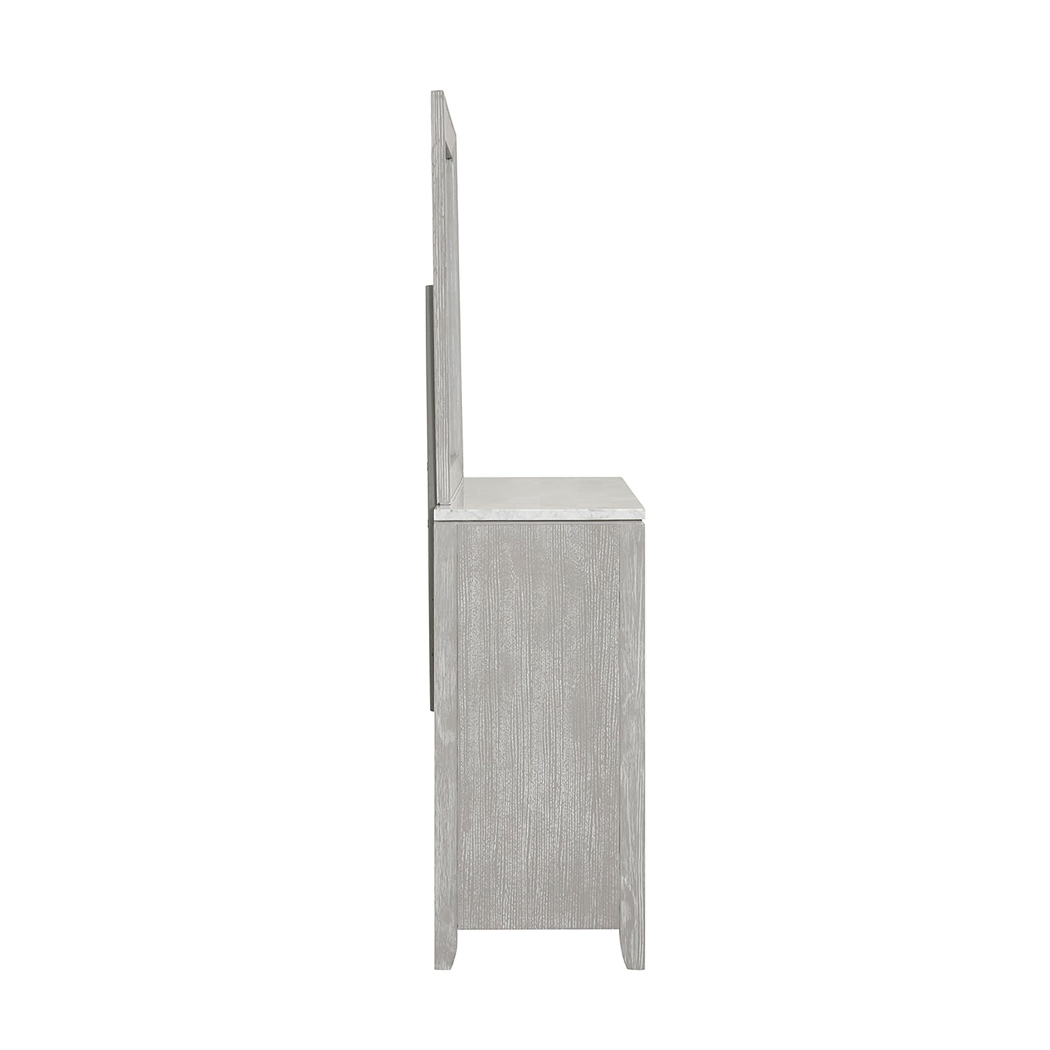 - Multi-Step Finish: The beauty of the natural wood grain is enhanced with a multi-step process including wire brushing and white glazing that results in a light, clear mist gray finish.