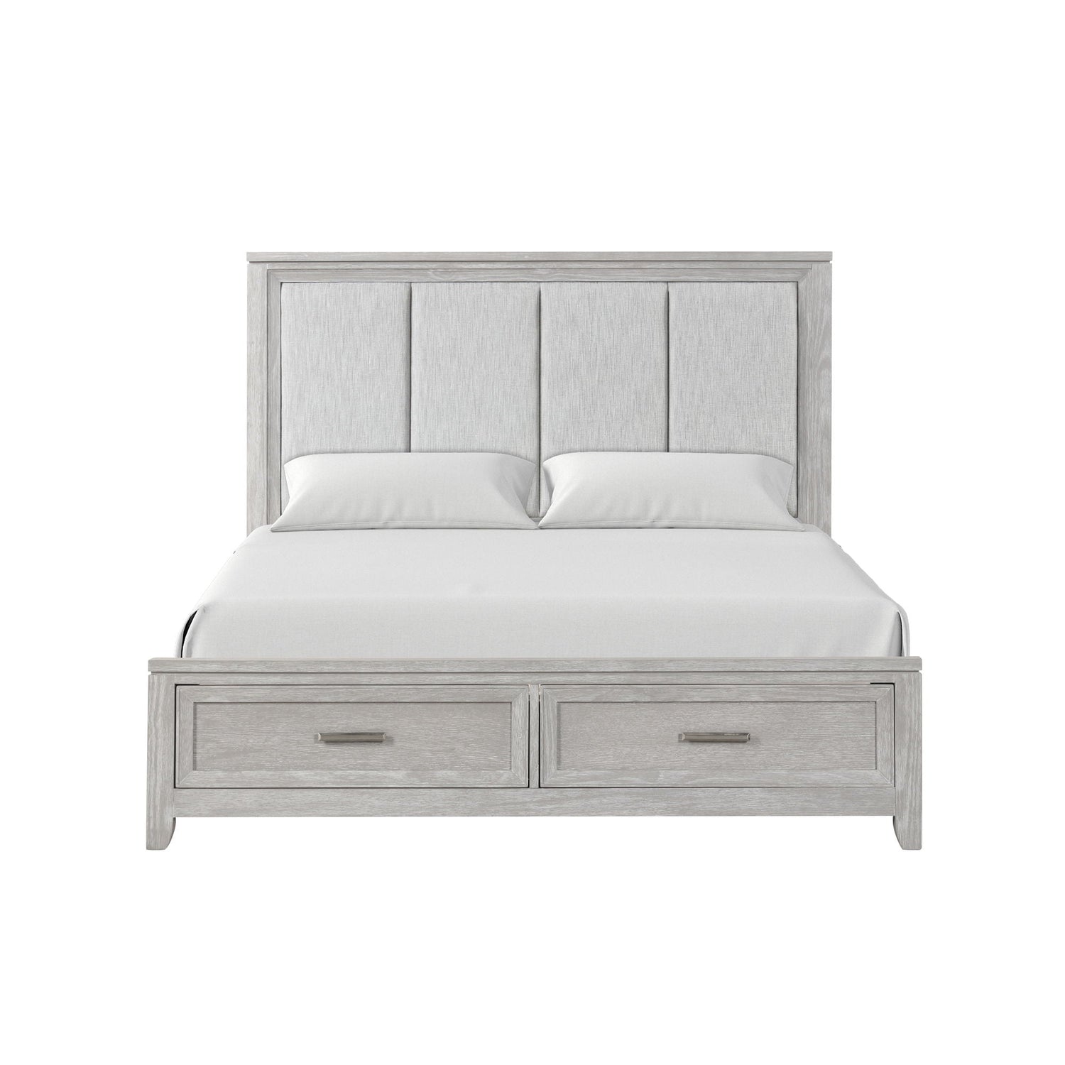 The Fiona Storage Bed is a testament to craftsmanship and design. Constructed with Acacia solids, manufactured woods, and oak veneer, this bed is a harmonious blend of strength and the natural allure of wood. The wood grain comes to life under a multi-step finish, featuring wire brushing and white glazing, culminating in a mist gray hue that complements any room. Classic elements like picture frame moldings and tapered legs are paired with modern drawer pulls to create a timeless piece. Its transitional style seamlessly adapts to both traditional and contemporary spaces. For comfort that doesn’t compromise on luxury, the headboard is upholstered in soft, 100% polyester fabric in gray, offering support for bedtime reading. The footboard integrates two spacious drawers, providing a clever storage solution for blankets and linens, optimizing your space with elegance and efficiency.