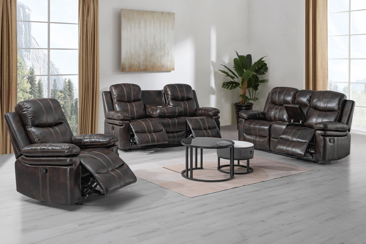The Kellen Motion Upholstery Set, featuring a dual reclining sofa and console loveseat, blends comfort and convenience with timeless style. Built to last, the sturdy frame is made from premium hardwoods and plywood, ensuring durability for years to come. The plush, resilient foam cushions, combined with advanced pocket coil technology, offer a cozy seating experience that retains its shape over time. Wrapped in rich chocolate-brown upholstery, the fabric, made from a blend of 80% polyester and 20% PU, mimics the luxurious look and feel of leather while providing breathability and sustainability. Thoughtfully designed details like contrast baseball stitching, side channels, and pillowed head and armrests bring a touch of elegance to any room. The smooth-action, heavy-duty reclining mechanism allows you to find your perfect position at the touch of a button, whether you''re kicking back or entertaining guests. Additional lifestyle features, such as a drop-down snack tray with beverage holders in the sofa and extra storage in the console loveseat, keep everything you need close at hand. The Kellen Set offers more than just comfort—it delivers a truly functional and stylish centerpiece for your home.