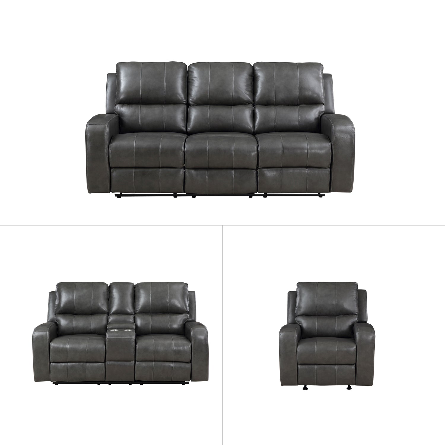 The Linton Top Grain Leather Set is a masterclass in luxurious living room design, offering uncompromising quality and sophistication. Crafted from rich top-grain leather, this set includes a dual reclining sofa, a console loveseat, and a glider recliner, each engineered for unparalleled comfort and longevity. The robust hardwood and manufactured wood frame, paired with coil spring cushions wrapped in resilient foam, ensure superior support, while no-sag seat suspension maintains the integrity of the seating. Sleek racetrack arms, luxurious bucket seats, and meticulously tailored plush backrests with contrast stitching present a refined, contemporary aesthetic. Smooth-action recliner mechanisms provide effortless relaxation, while the console loveseat offers thoughtfully designed lifestyle features, including a center console for storage and built-in cupholders. Designed for those who appreciate high-end craftsmanship and timeless style, the Linton set elevates any living space with enduring elegance and comfort.