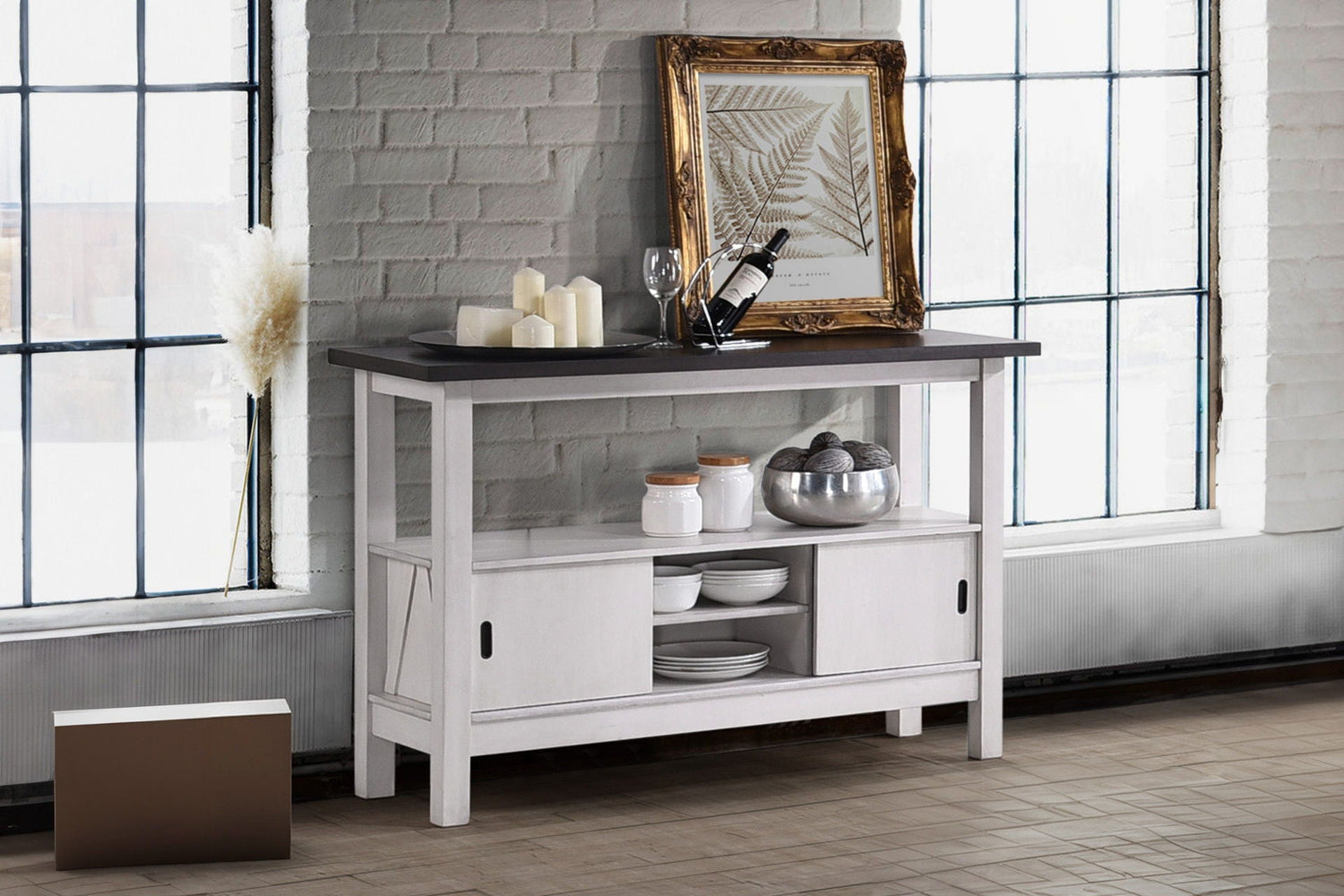 The Maisie Dining Room Server combines quality craftsmanship with rustic charm, making it a practical and stylish addition to any dining space. This two-tone storage cabinet, crafted from solid rubberwood, manufactured woods, and Mindy wood veneers, ensures a sturdy and long-lasting kitchen storage solution. The buffet features a dark brown top with a smooth finish that contrasts beautifully with the white, slightly distressed base, enhancing its farmhouse appeal. Designed for both storage and display, the top can be used as a sideboard for hosting parties, while the spacious cabinets provide ample room for china pieces and dishes. The Maisie Server blends the warmth and texture of rustic elements with the sleek, clean lines of modern design, creating a dining space that feels both fresh and timeless. Perfect for organizing and showcasing your dining essentials, this server is a versatile and attractive piece for any home.
