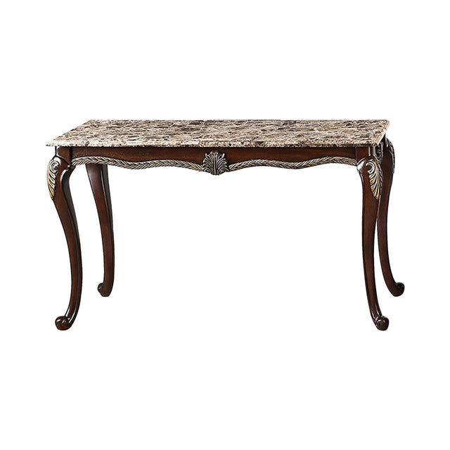 - Sophisticated Touches: The marble top features a rich blend of deep brown tones with intricate white and beige veining patterns running throughout. The swirling pattern creates a luxurious and dynamic appearance.. The combination of the dark, earthy hues with lighter streaks offers a striking contrast that complements the ornate wooden base, adding a touch of sophistication and timeless beauty to the piece.