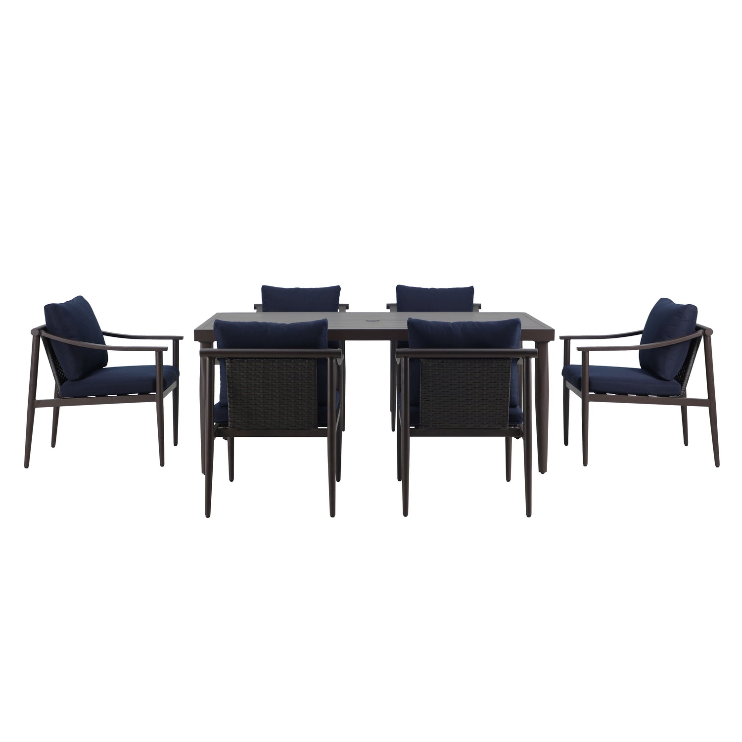 Experience outdoor dining in style with the Moana Outdoor Patio Dining Set, featuring a durable table and side chairs with comfortable blue cushions. The aluminum frames boast a baked-on powder coat finish, providing a strong foundation that resists scratches and enhances longevity. The table''s classic slatted top not only adds aesthetic appeal but also aids in water drainage, making it practical for any weather. Crafted from high-density PE wicker, the set offers the timeless look of wicker with the modern benefits of being low-maintenance, colorfast, and resistant to water, mildew, and fading. The chairs come with cushions made from our exclusive Sundura™ fabric, a solution-dyed 100% polyester that resists fading, mildew, and moisture, ensuring vibrant color season after season. High-density 6cm foam cushions provide comfortable seating, and with a generous 72-inch length, the table accommodates up to eight people, perfect for family dinners or outdoor gatherings. The minimalist design with clean lines and a sleek dark frame allows this dining set to seamlessly blend into various outdoor settings, offering a stylish and understated look for contemporary spaces.