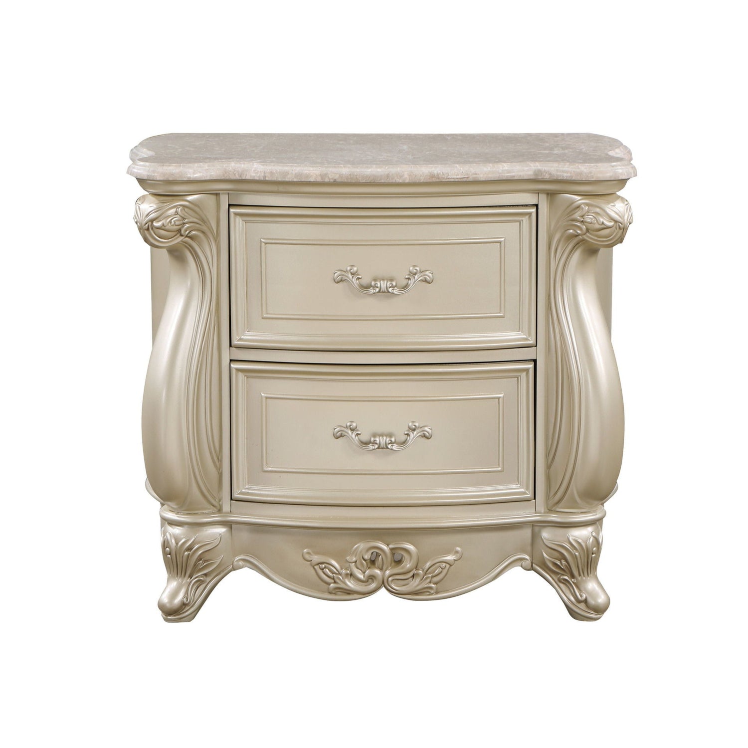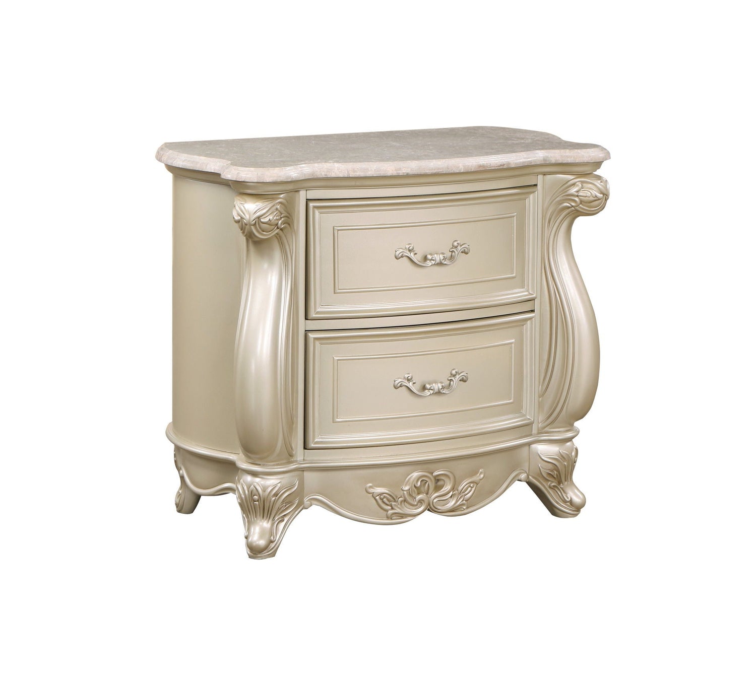 The Monique Marble Top 2 Drawer Nightstand in Champagne combines heirloom quality construction with French Provincial elegance. Crafted with poplar solids and birch veneers, this nightstand ensures strength and durability. Reflecting the charm and sophistication of French countryside homes, it features soft curved lines, intricate carvings, scalloped edges, and decorative moldings. The intricate, multi-step champagne finish, enhanced with antique gold glazing, highlights the moldings and ornamental carvings, enhancing the natural beauty of the wood. Built to last, the drawers feature French and English dovetail joinery and glide smoothly on full-extension mechanisms with finished interiors for snag-free storage. The genuine marble top follows the furniture's elegant curves, with bowfront drawers and cabriole legs completing the lavish look. Practical features include velvet-lined drawers and roomy storage in the nightstand's two drawers. Combining traditional style with modern comforts, the Monique Marble Top Nightstand offers a luxurious addition to any bedroom.