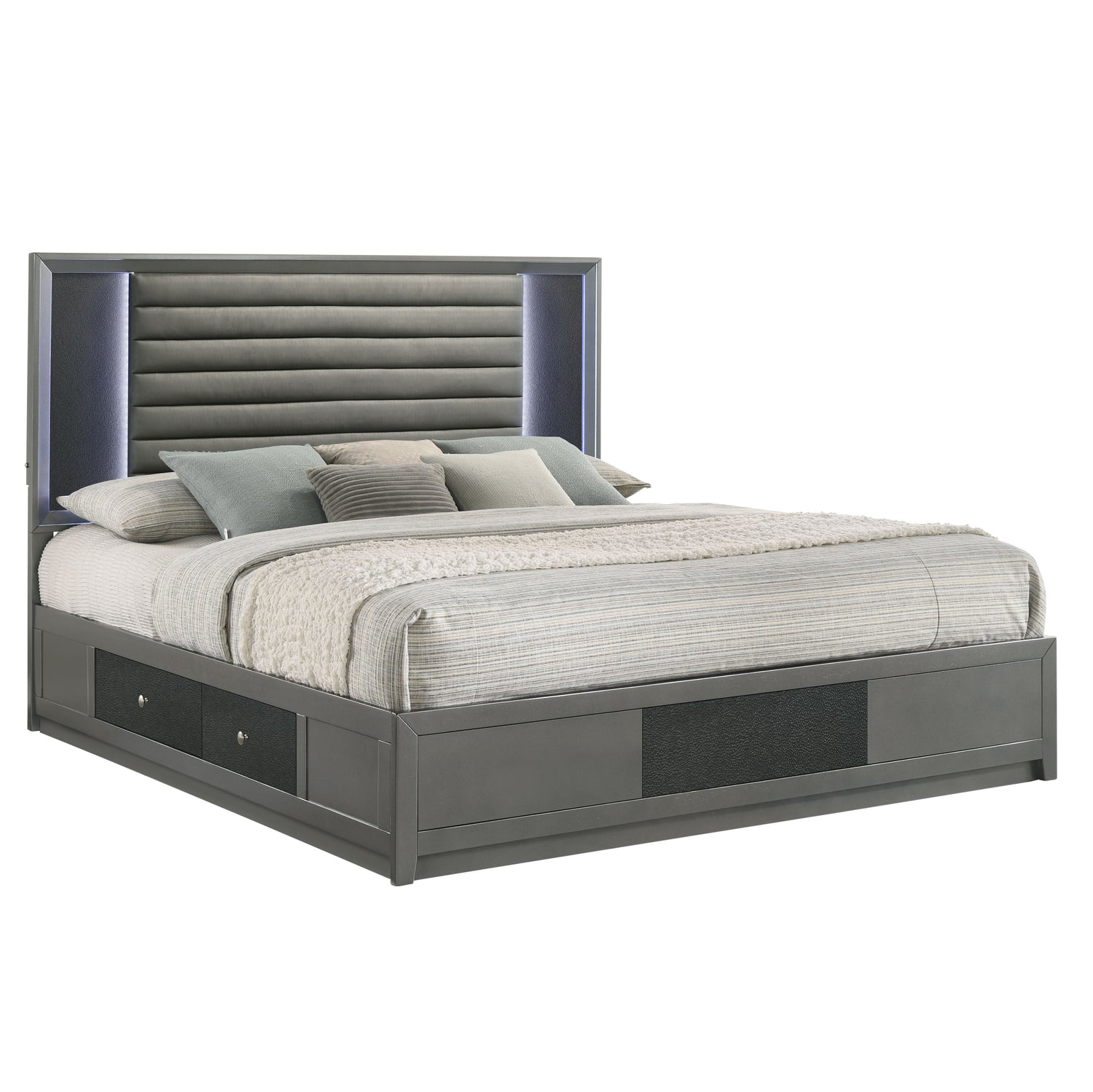 Discover the Nocturne Bed, a fusion of robust construction and chic design that promises both style and functionality. Crafted with the resilience of Rubberwood and the finesse of Okoume veneers, this bed is built to last. The slate gray finish, with its subtle sheen, harmonizes with textured charcoal panels for a sophisticated color palette. The headboard, a statement of subtle glam, boasts a backlit, rolled upholstery panel, offering an inviting space for relaxation. The bed’s design is mindful of space, incorporating four underbed drawers to maximize storage efficiency. Its contemporary aesthetic, highlighted by silver legs and ambient lighting, creates a modern sanctuary in any bedroom. This bed is not just a piece of furniture; it’s a lifestyle upgrade for those who appreciate a blend of comfort and elegance.