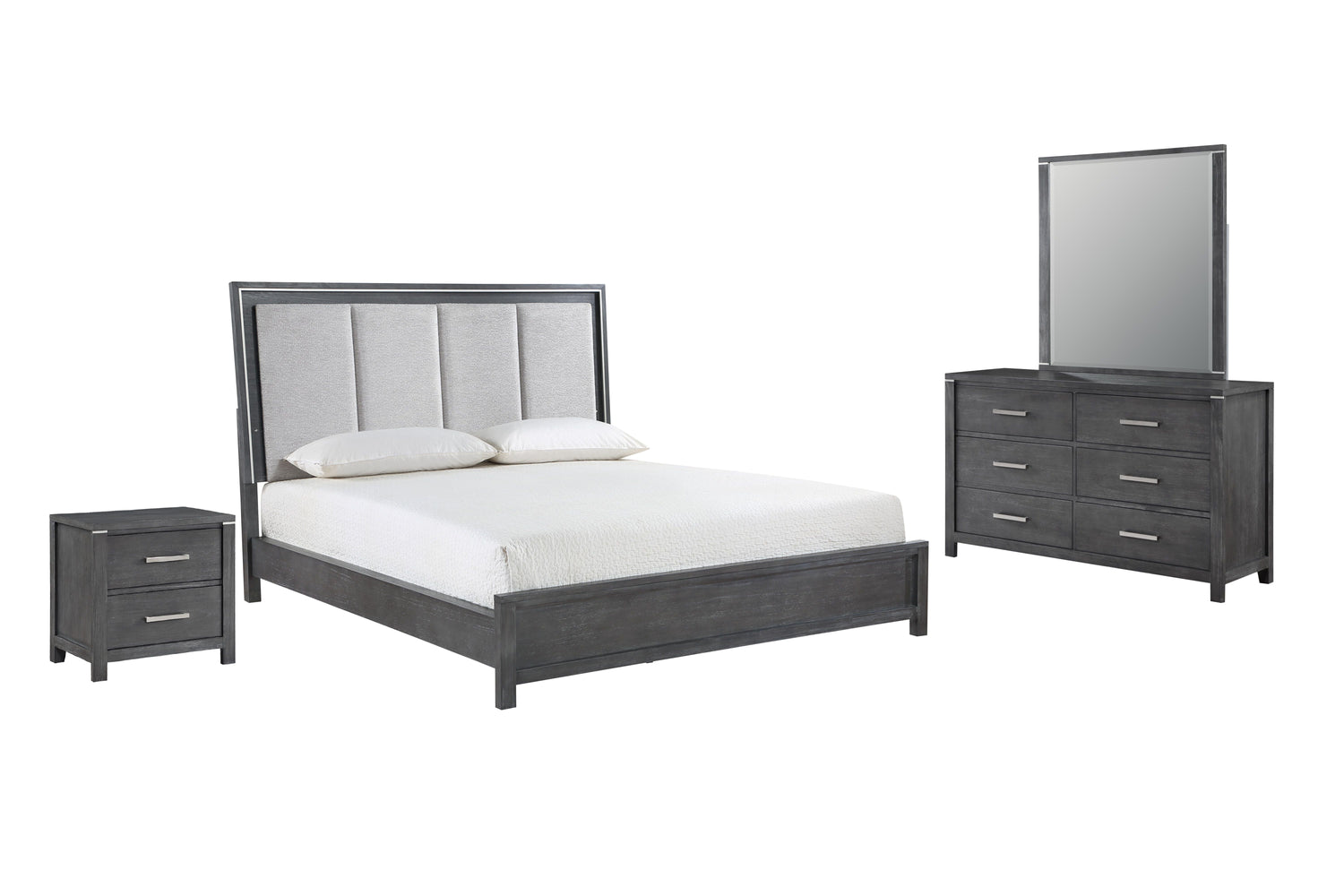 Odessa - Bedroom Set - Dark Gray / 4 Pc. Bed, Dresser, Mirror, Nightstand / Queen is backordered and will ship as soon as it is back in stock.