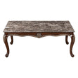 - Sophisticated Touches: The marble top features a rich blend of deep brown tones with intricate white and beige veining patterns running throughout. The swirling pattern creates a luxurious and dynamic appearance.. The combination of the dark, earthy hues with lighter streaks offers a striking contrast that complements the ornate wooden base, adding a touch of sophistication and timeless beauty to the piece.