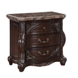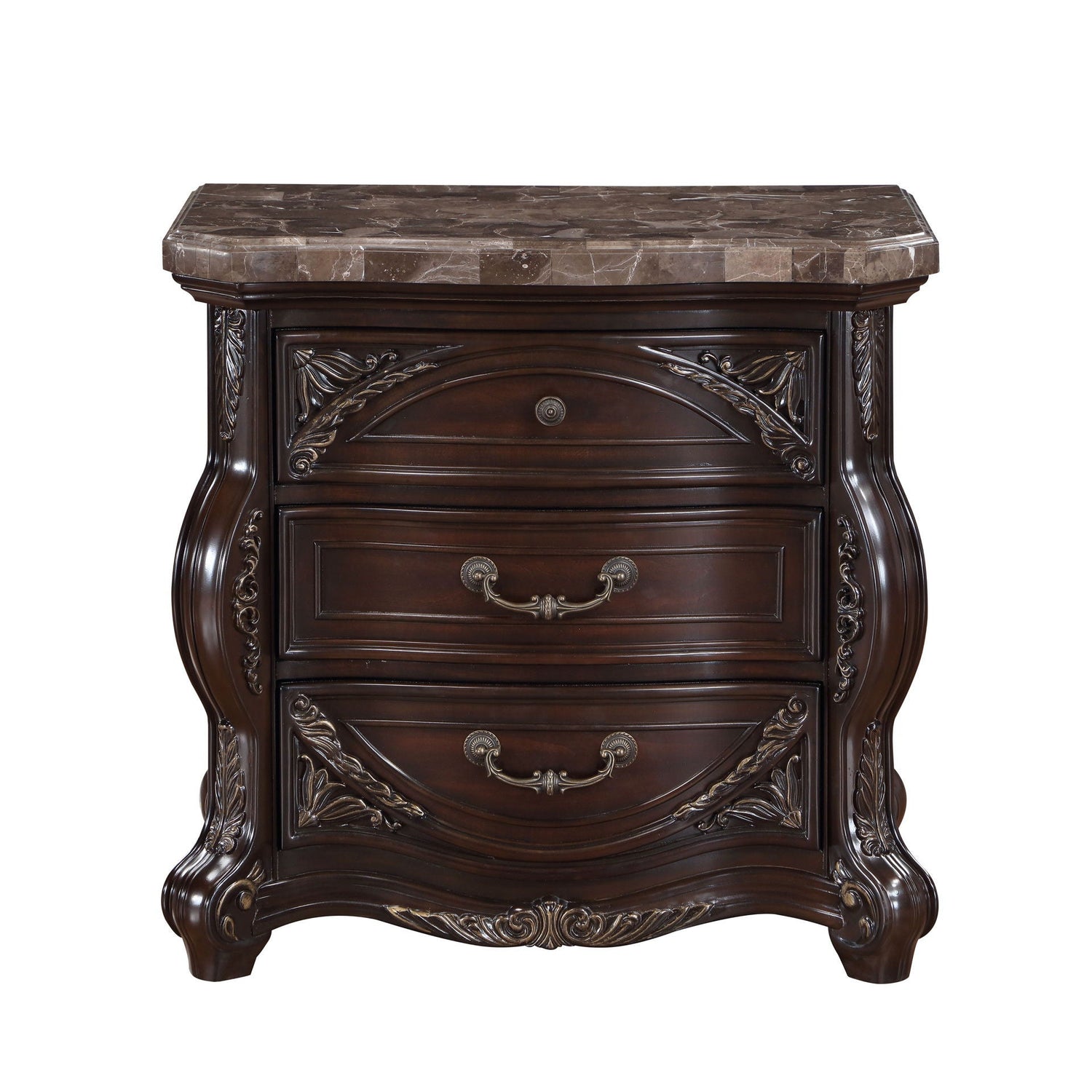 - Traditional Elegance: Showcasing ornate carvings and elegant drawer pulls, this design embodies timeless sophistication and exceptional craftsmanship. The signature circular carving, a hallmark of the collection, is prominently displayed on the fronts of the nightstand, adding a touch of distinction and harmony.