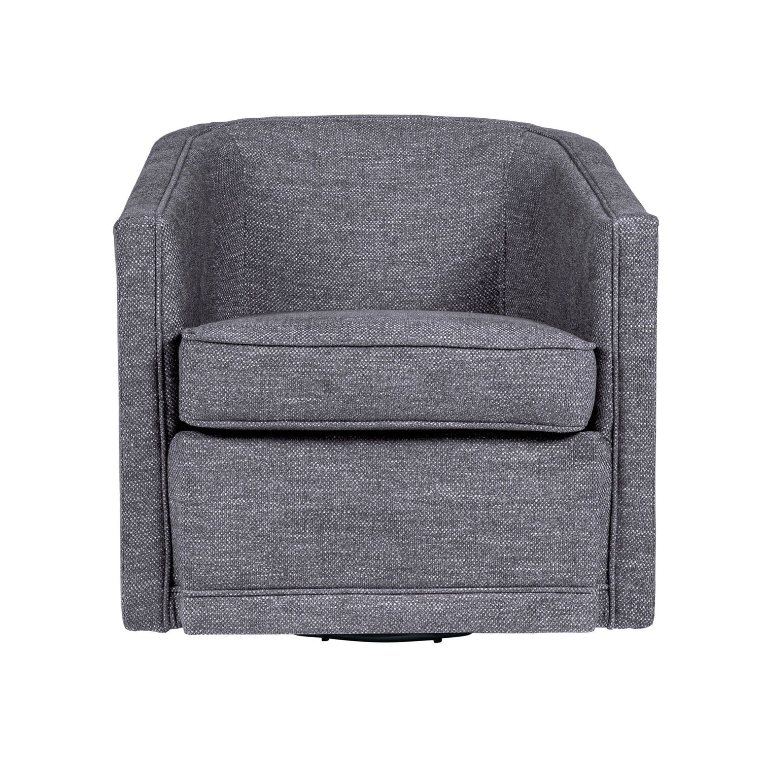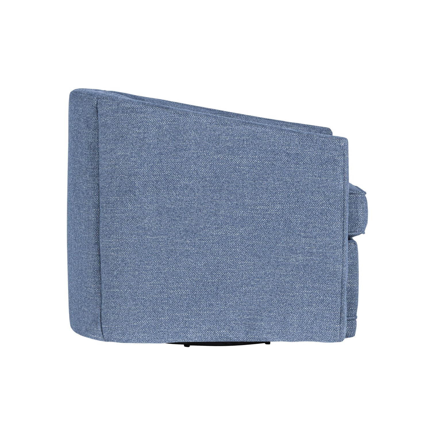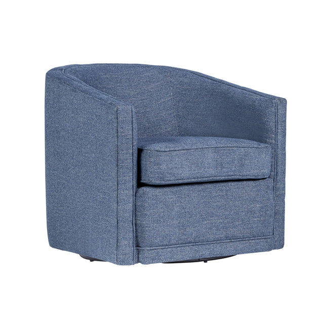 Introducing the Poppy Swivel Chair, a versatile seating solution perfect for conversations and relaxation. Crafted with care in the USA, this transitional piece boasts a curved tight back filled with plush foam for optimal comfort. With its square arms and swivel feature, it offers both style and functionality. Built to last, it features a solid and manufactured wood frame with reinforcing corner blocks and sinuous springs for durability. Upholstered in blue 100% polyester fabric, this chair effortlessly complements any decor. Plus, with no assembly required, you can enjoy its comfort right out of the package. Upgrade your living space with the Poppy Swivel Chair today.