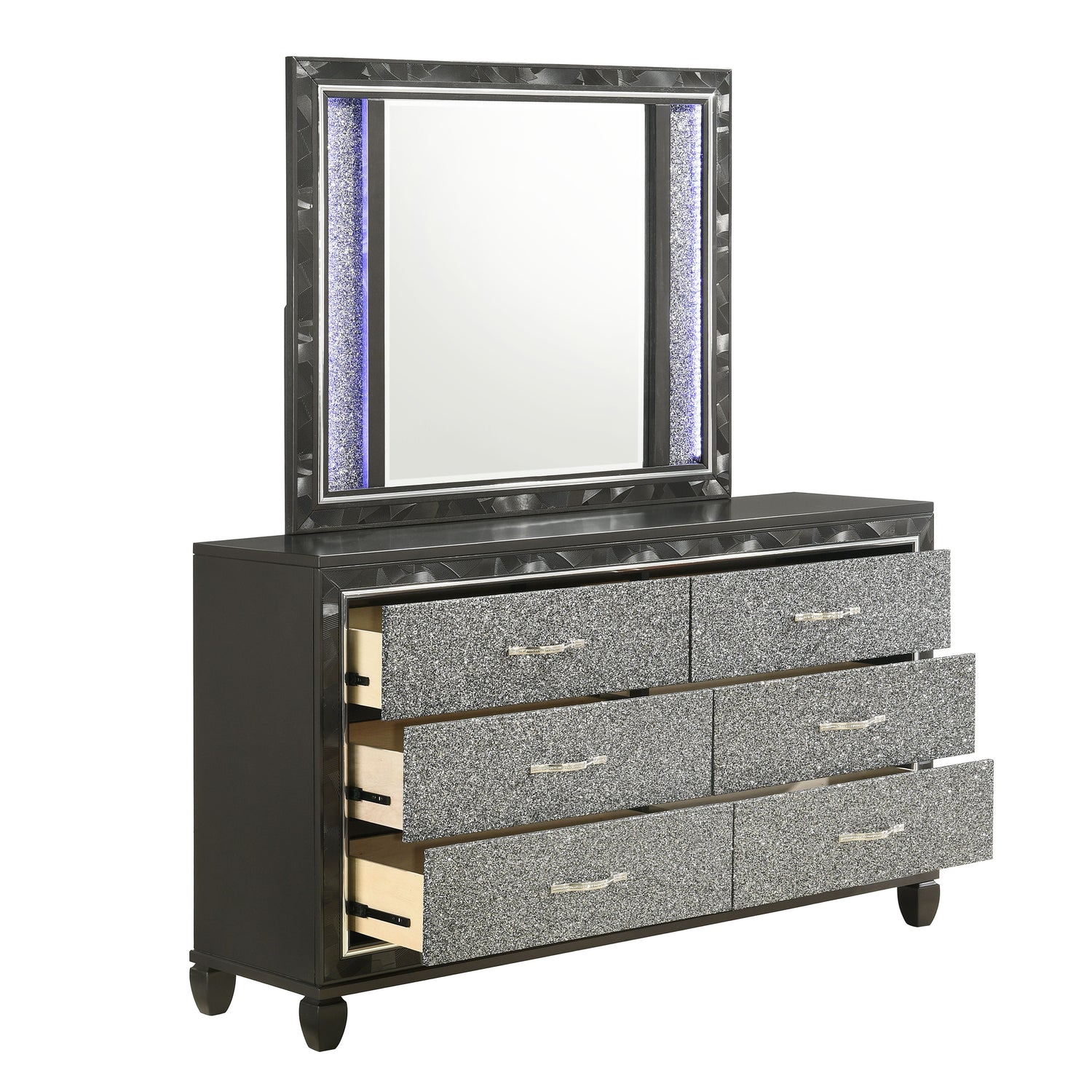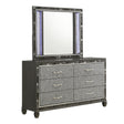 Experience sophistication and functionality with the Radiance Dresser & Mirror. Crafted with a blend of Solid Rubberwood and manufactured woods, this set ensures unmatched stability and durability. The semi-gloss lacquer pearl finish adds a modern touch, while glossy textured inlays and mylar trim frame the drawers, showcasing a luxurious crushed crystal look. With six English dovetail drawers featuring full extension glides, snag-free storage is effortless. The clear, low distortion beveled glass mirror provides a true reflection, accentuated by LED lighting that adds a touch of sparkle to your space. Elevate your bedroom with the Radiance Dresser & Mirror for a blend of elegance and practicality.