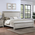 The Silver Sands Upholstered Panel Bed is a perfect blend of durability and style, making it a standout choice for any bedroom. Constructed from solid pine, manufactured woods, and oak wood veneers, this bed offers a robust and stable foundation. Its versatile design showcases a transitional style that merges clean, simple lines with a rustic wood finish, creating a calm and inviting atmosphere. The misty gray finish is meticulously hand-applied in multiple steps, resulting in a soft, weathered look that highlights the natural grain and mineral patterns of the wood. The bed''s elegant design features a raised panel footboard and a plushly padded headboard, complemented by traditional hardware and decorative dentil moldings for a touch of farmhouse charm. The sophisticated appeal of the nicely shaped crown moldings completes the look. Choose the Silver Sands Upholstered Panel Bed for a combination of quality construction and timeless design that enhances any bedroom decor.