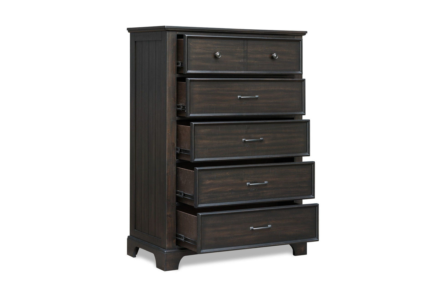 - Contemporary with a Rustic Touch: With a rich dark finish and sleek, clean lines and simple metal hardware, the Stafford County bedroom has a cohesive and sophisticated look.