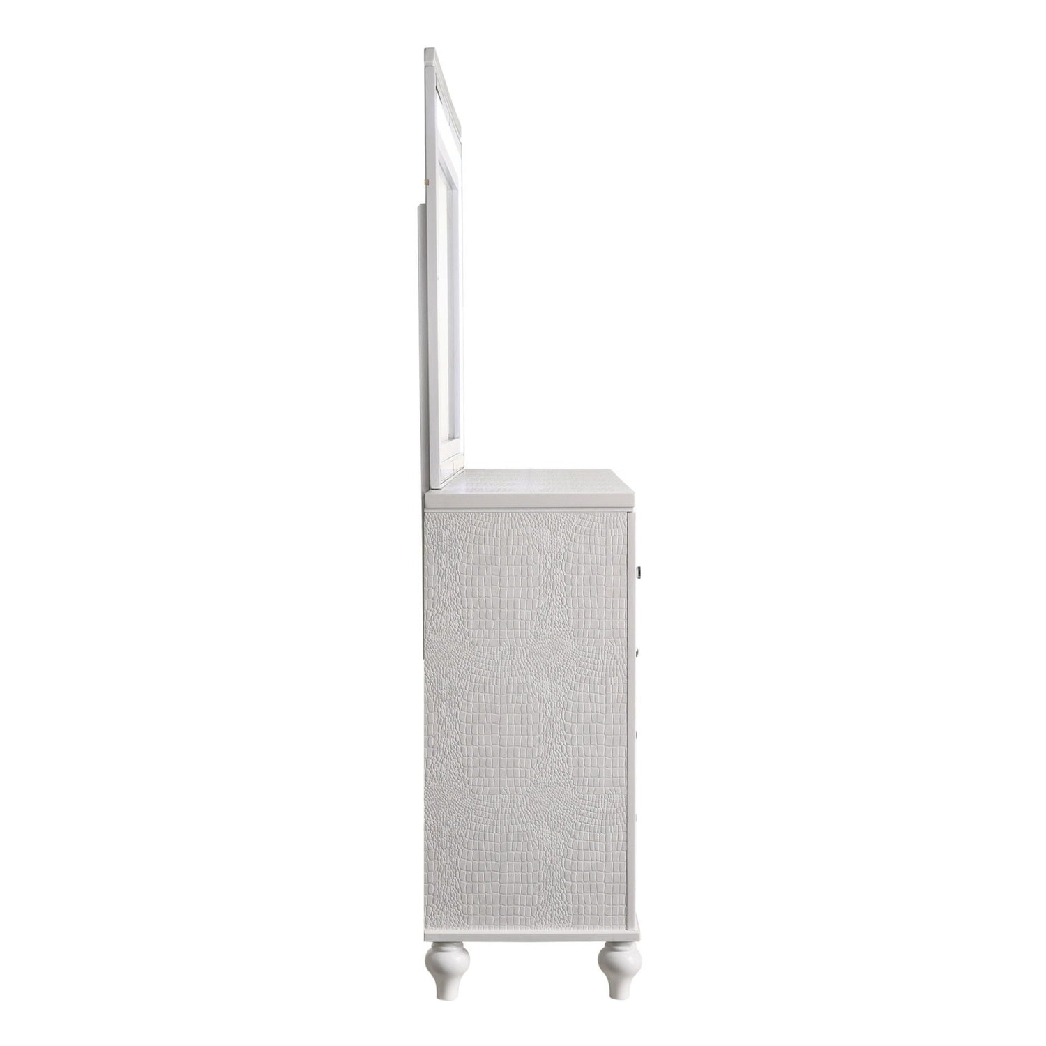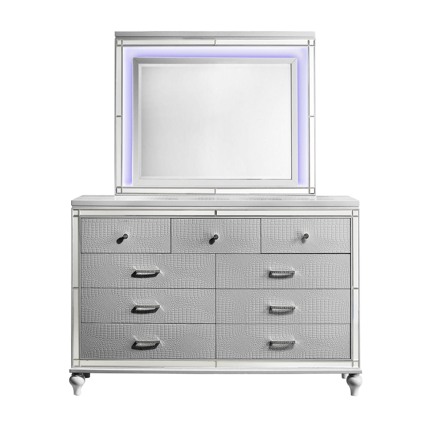 Featuring a lighted and upholstered headboard, the Valentino collection is brimming with features. Embossed inlays, mirrored borders, and turned feet all add to the unique styling of this suite.