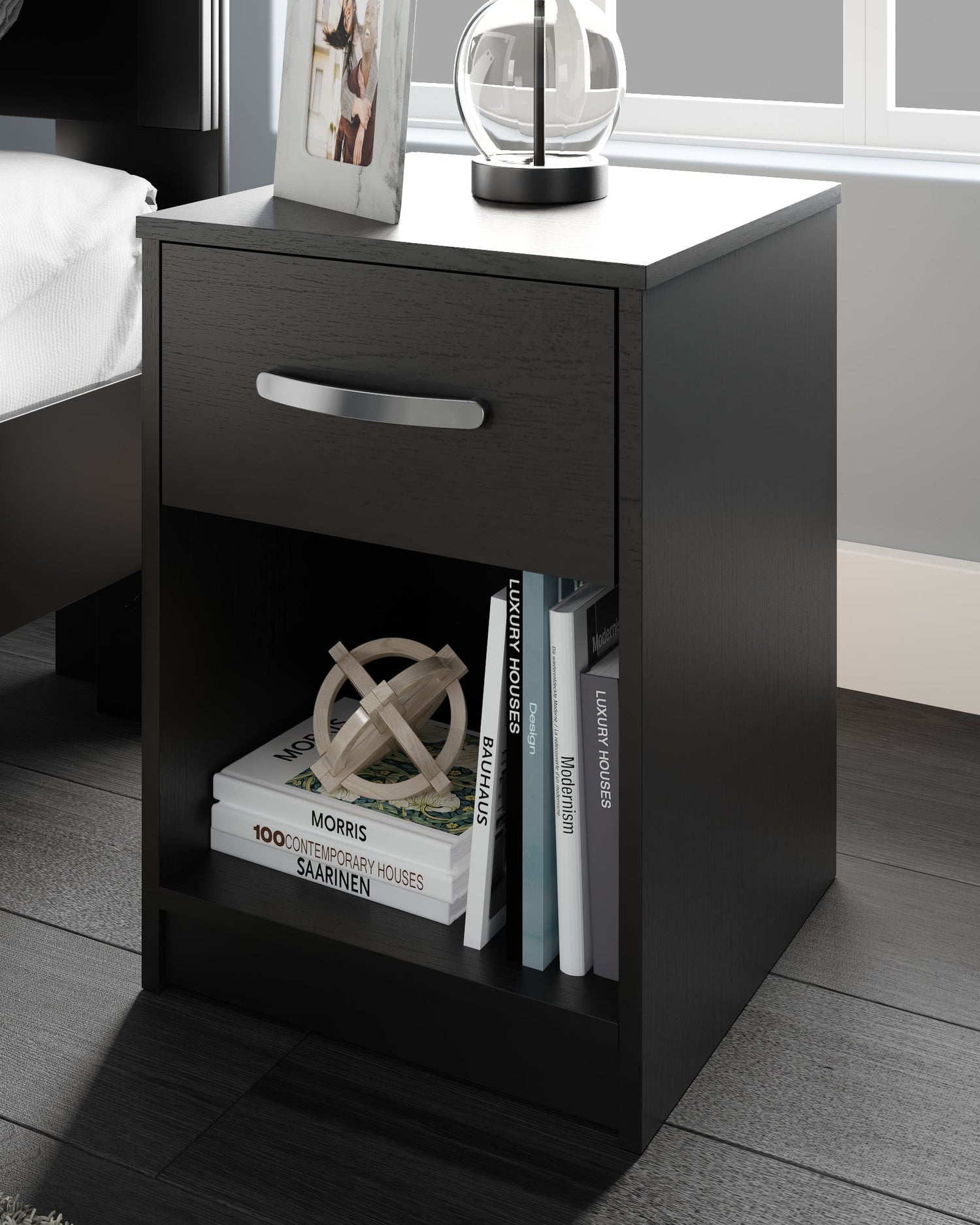 Practical and attractive, this nightstand blends seamlessly with modern decor and makes a smart addition to a bedroom. The smooth-gliding drawer on metal ball bearings is ideal for bedside essentials. An open cubby provides a nice place for a storage basket or vase. The nightstand's curved metal pull in a brushed nickel-tone finish adds to the streamlined aesthetic. Combine with other units in the collection to create a room that’s sleek and stylish.