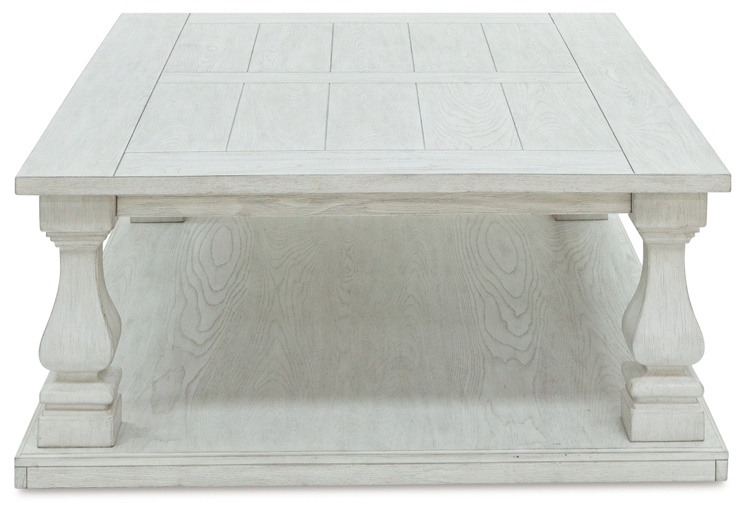 Elevating the art of casual traditional styling, this coffee table is your heavenly home accent realized. Oversized and indulgent, this beautiful piece wows with a wide plank design and square-shaped baluster legs, leaving you absorbed in its charisma. 2 Matching end tables included.