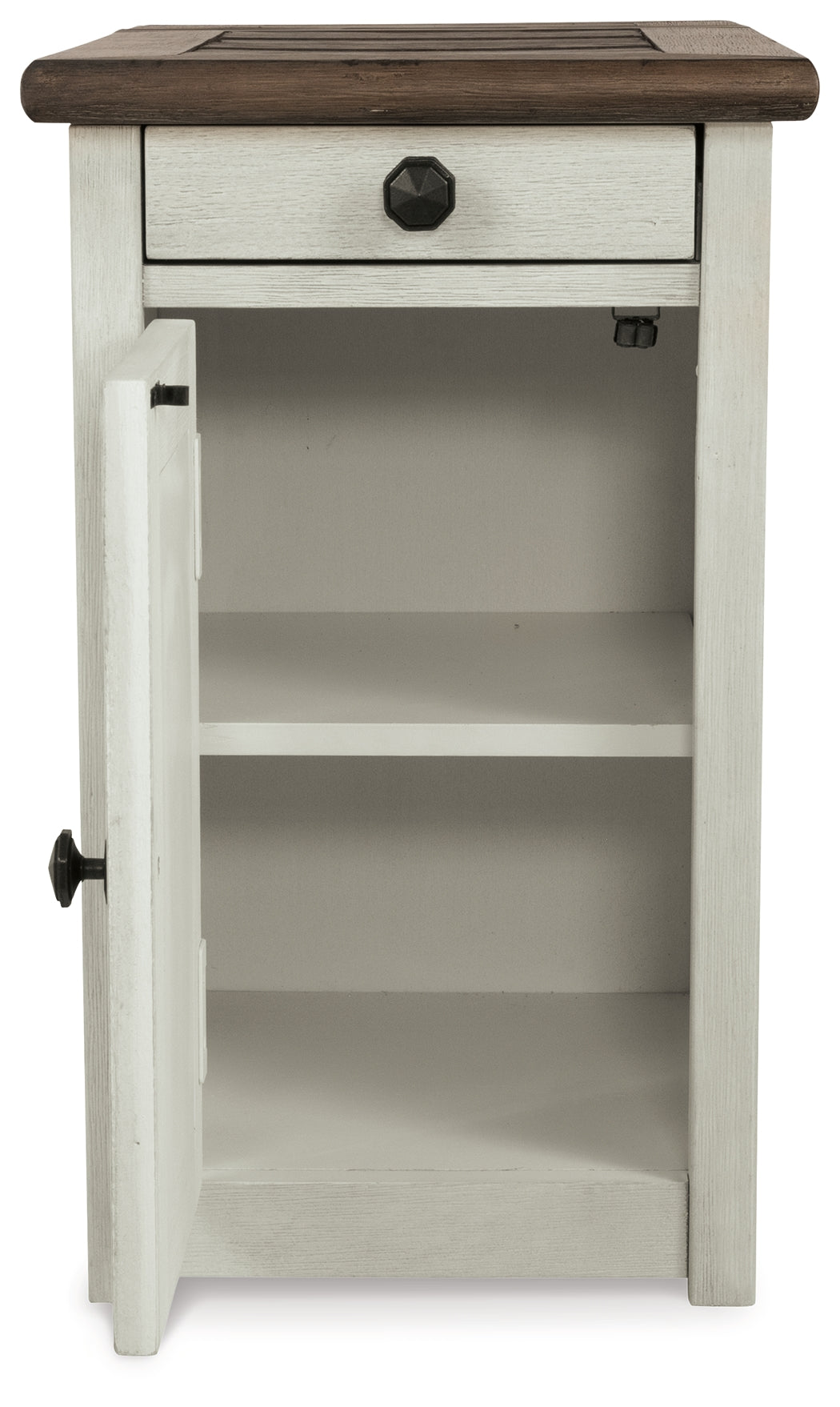 - T637-7 chair side table has pullout tray, large door for storage and lift up top (back section) that exposes an AC power supply with 2 USB charging ports.