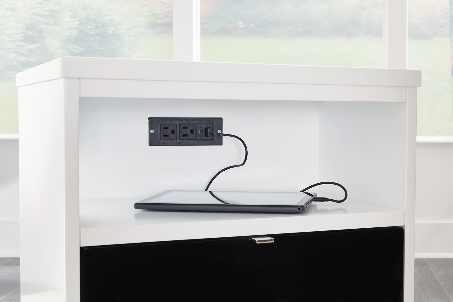 - T756-7 chairside table with drawer incorporates a 110V power supply with USB-A / USB-C charging ports located in a small cubby space for keeping your devices charging close at hand.