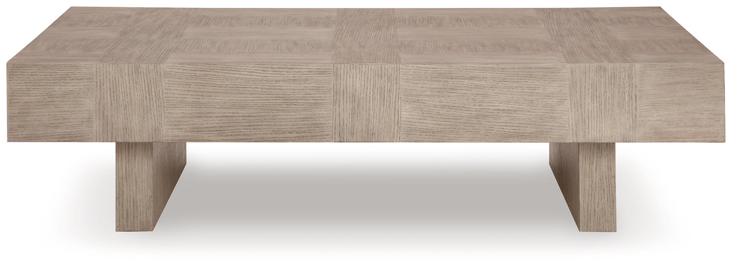 This striking coffee table looks equally at home in traditional or modern settings. A textural light gray finish offers a casual modern look, while the double plinth base exudes a classically contemporary sensibility. This timeless design adds a transitional touch that's sure to serve you well. 2 Matching end tables included.