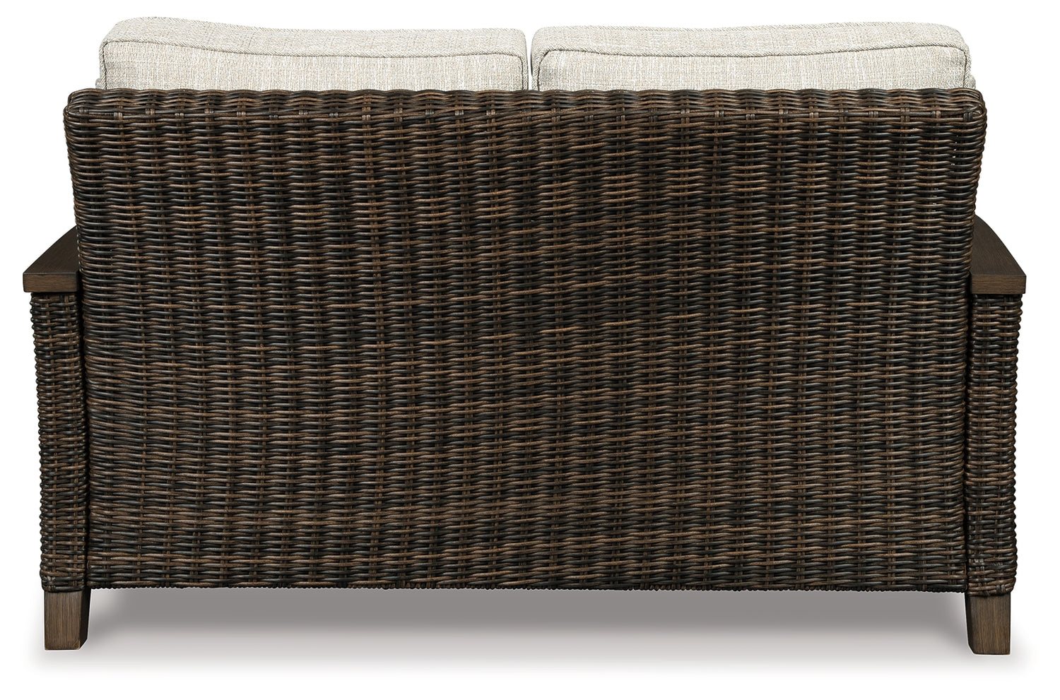 - Collection has hand woven resin wicker with rust free aluminum frames with a brown wood-look finish.
