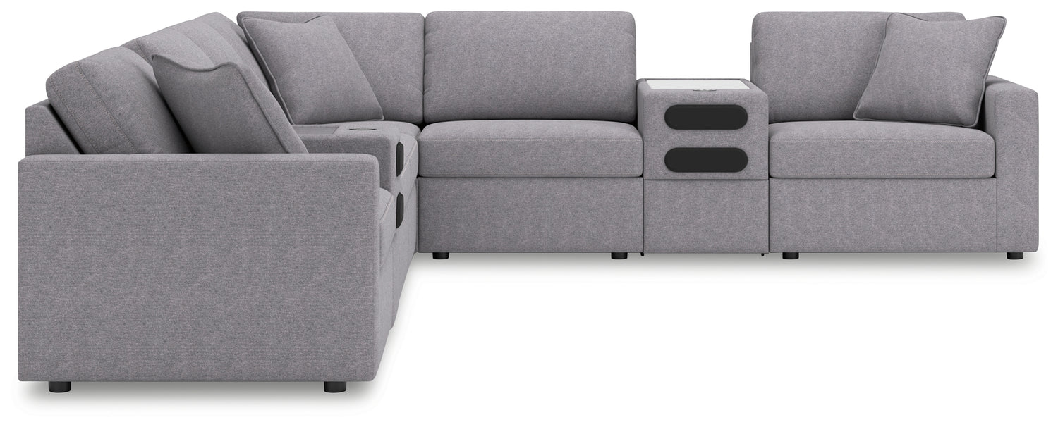 - Includes 8 modular pieces: left-arm facing corner chair, 3 armless chairs, audio console with storage, console with storage, wedge and right-arm facing corner chair