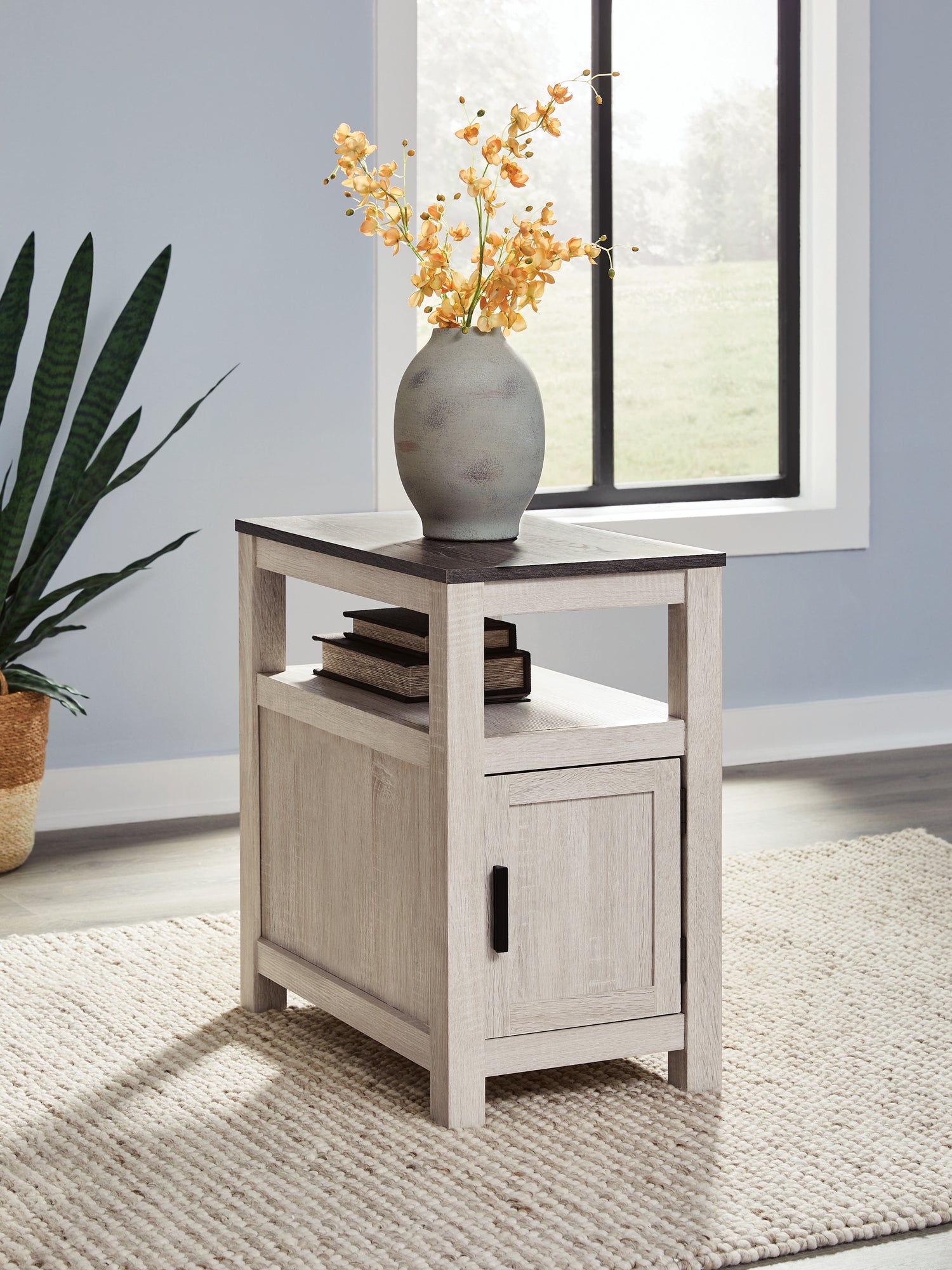 Embrace simply stylish sofa-side function with this chairside end table. Keep entertainment essentials like remotes, coasters and more close with the handy storage cabinet. Battery running low? Built-in USB ports keep easy charging at your fingertips. And with the table's replicated weathered gray finish, it has the versatility to pair with aesthetics from casual to farmhouse.