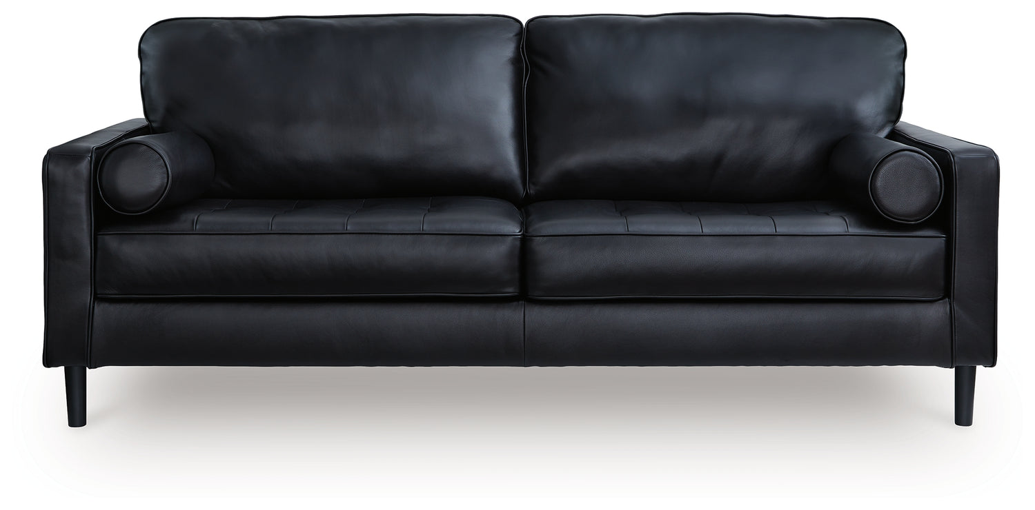 - A new contemporary 2 over 2 slim, leather match, track arm sofa with non reversible tuft cushions.