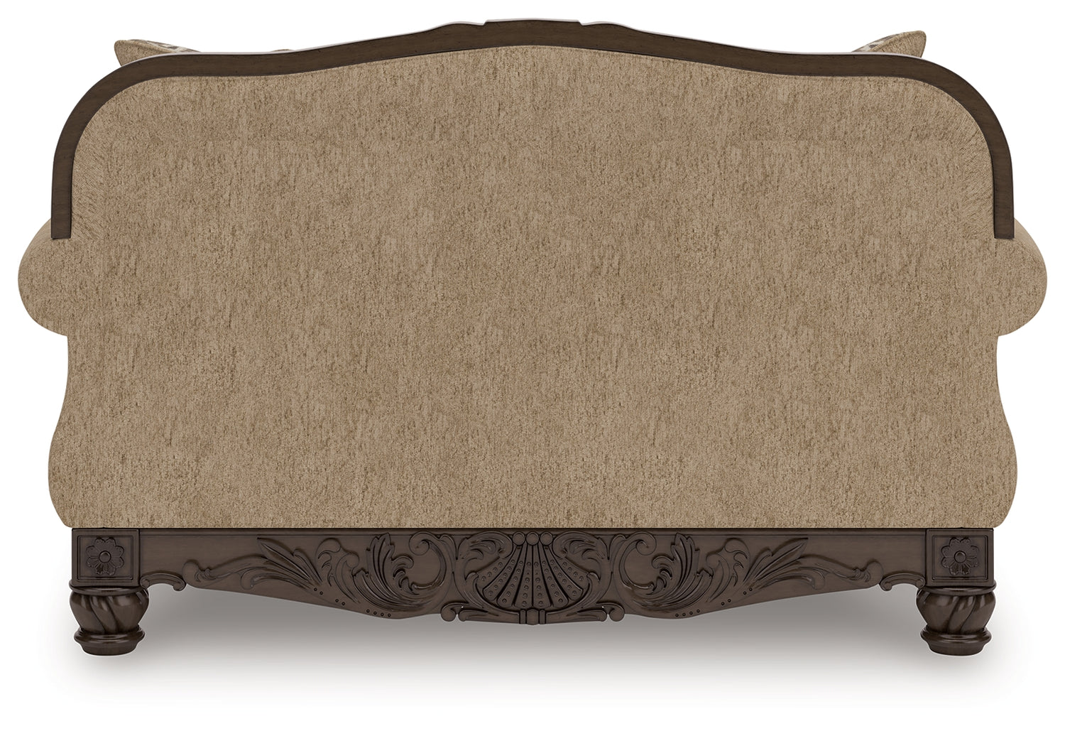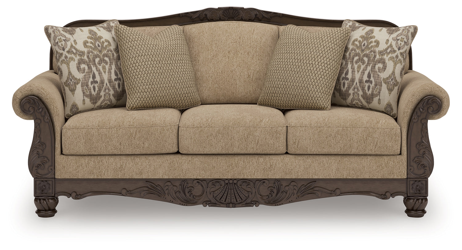 This seating package is a gorgeous example of new traditional design. Its graceful profile and plush cushions merge classic flair with modern comfort. Golden high-luster textured upholstery sets the tone for an easy elegant look, while carved details and decorative turned legs make a grand statement. Inspired by then, reinvented for the here and now.