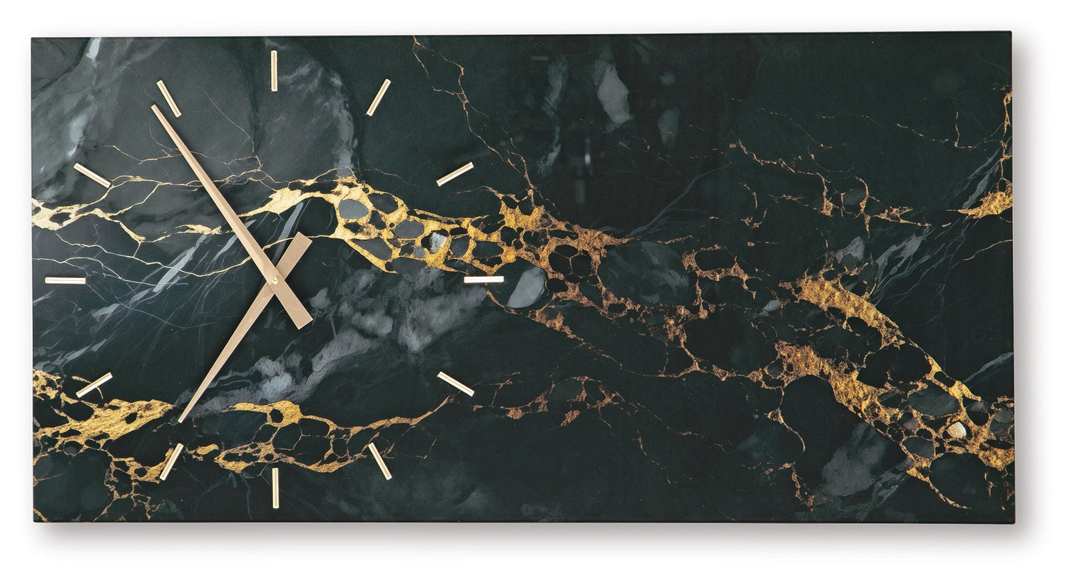 Take a turn toward the contemporary with this wall clock. Bold and beautiful, its printed glass pattern emulates the look of marble in a stunning take on everyday luxury. Hang this piece vertically or horizontally—either way, it makes a curated statement.